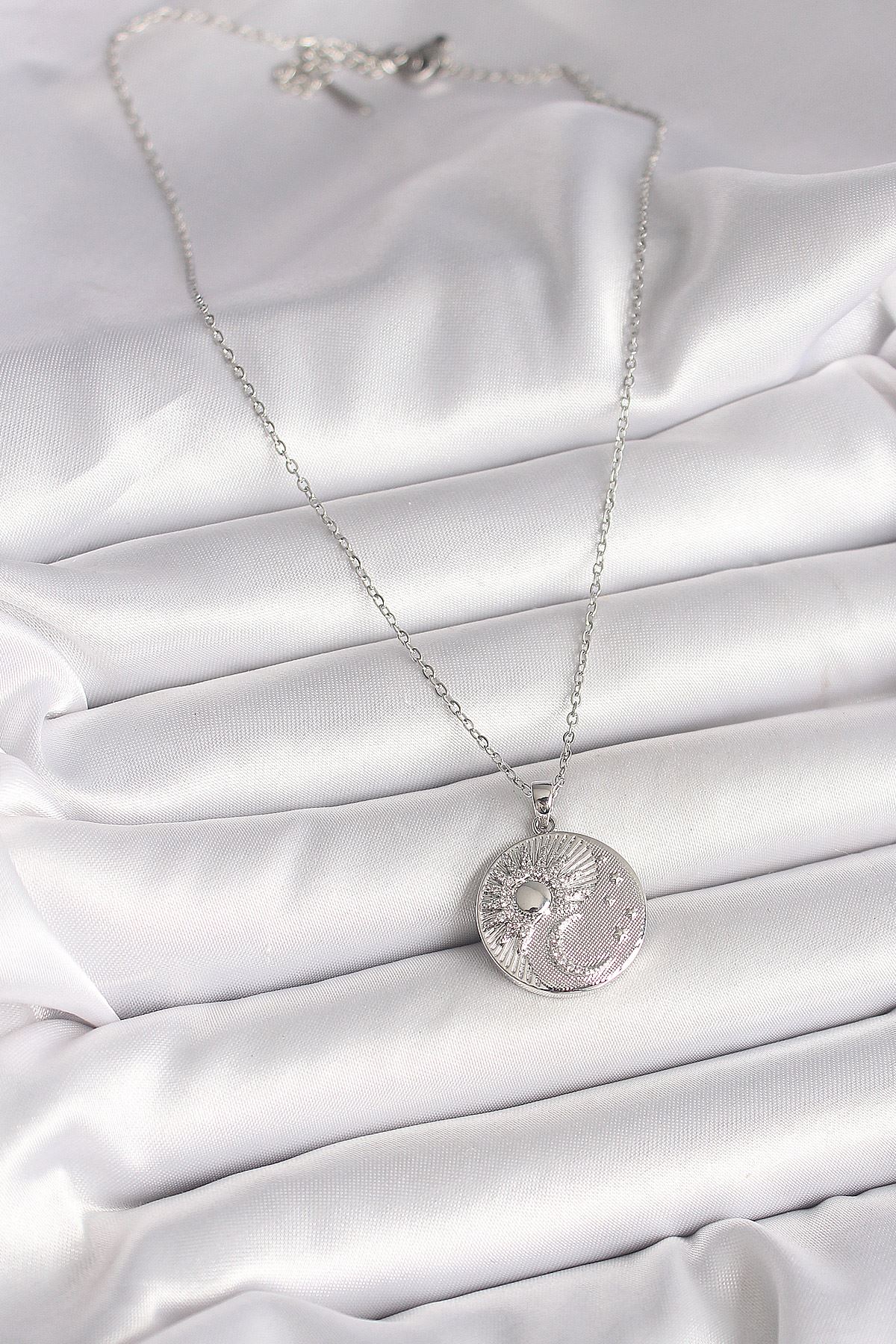 316L Çelik Gümüş Renk Zincir Zirkon Taşlı Ay Güneş İşlemeli Madalyon Model Kadın Kolye - TJ-BKO9959