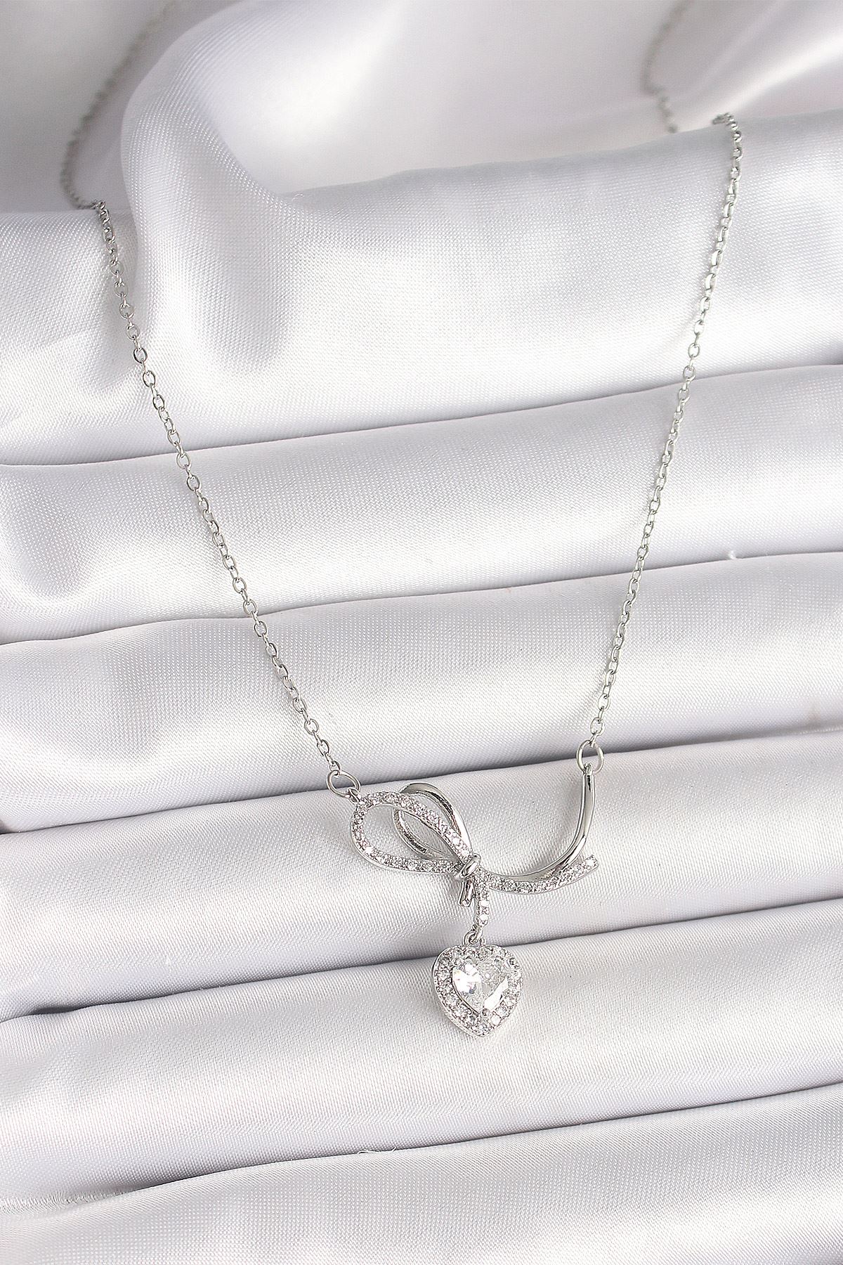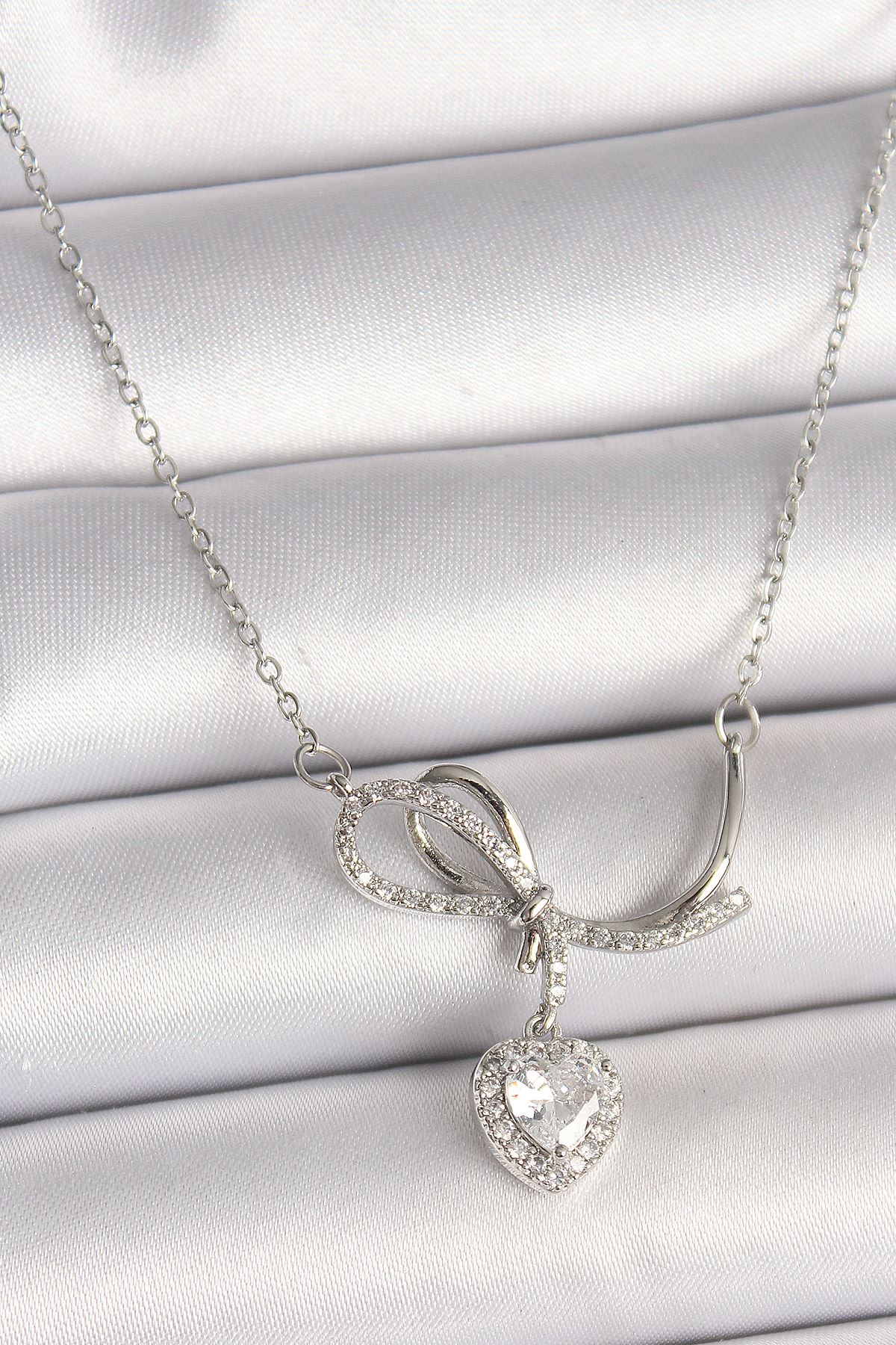 316L Çelik Gümüş Renk Zincir Zirkon Taşlı Düğüm Sallantı Kalp Figür Kadın Kolye - TJ-BKO9856