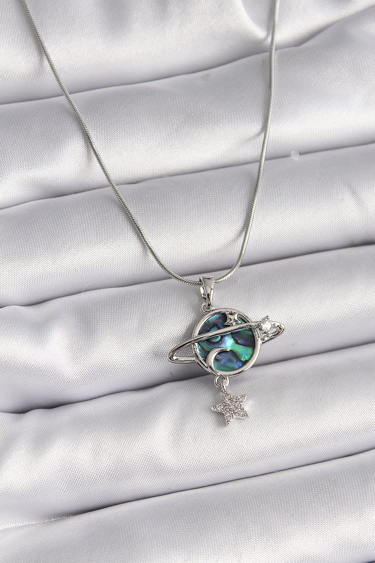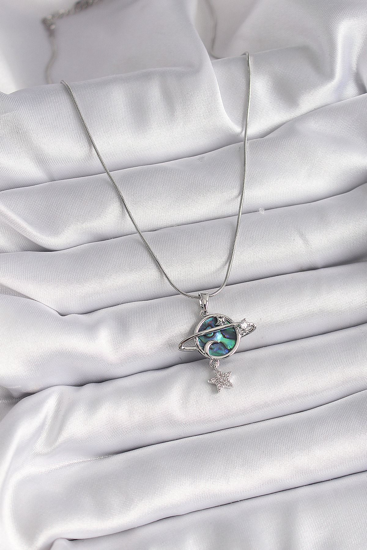 316L Çelik Gümüş Renk Zincir Zirkon Taşlı Gezegen Model Kadın Kolye - TJ-BKO9478