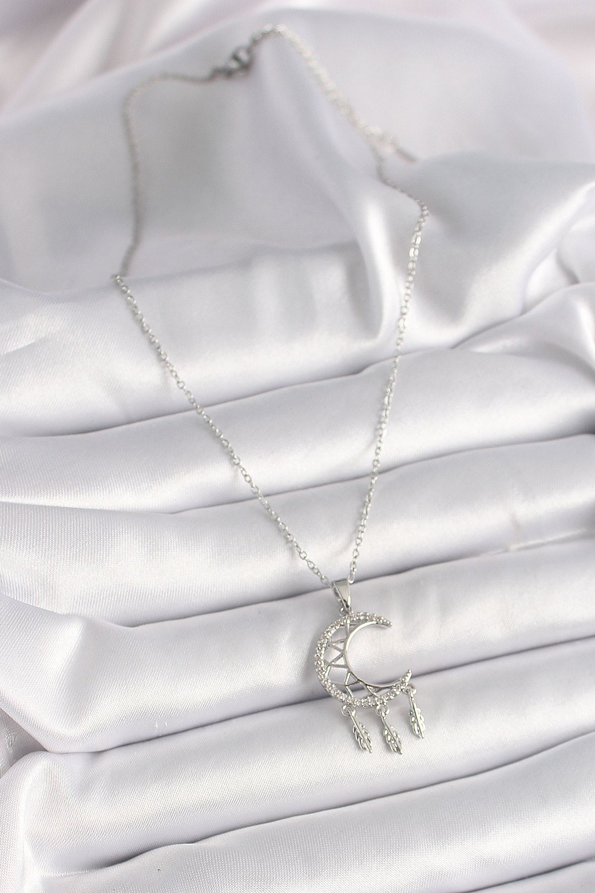 316L Çelik Gümüş Renk Zincir Zirkon Taşlı Hilal Model Sallantı Yaprak Detay Kadın Kolye - TJ-BKO9651