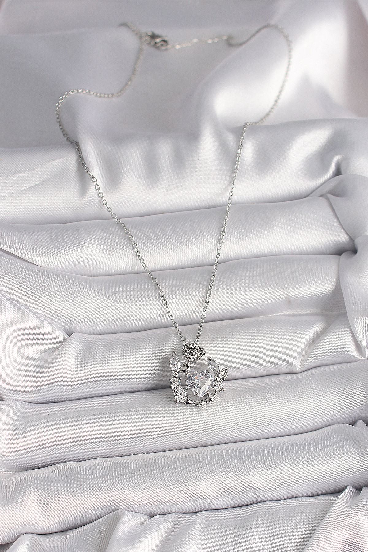 316L Çelik Gümüş Renk Zincir Zirkon Taşlı Kalp Figür Gül Detay Kadın Kolye - TJ-BKO9809