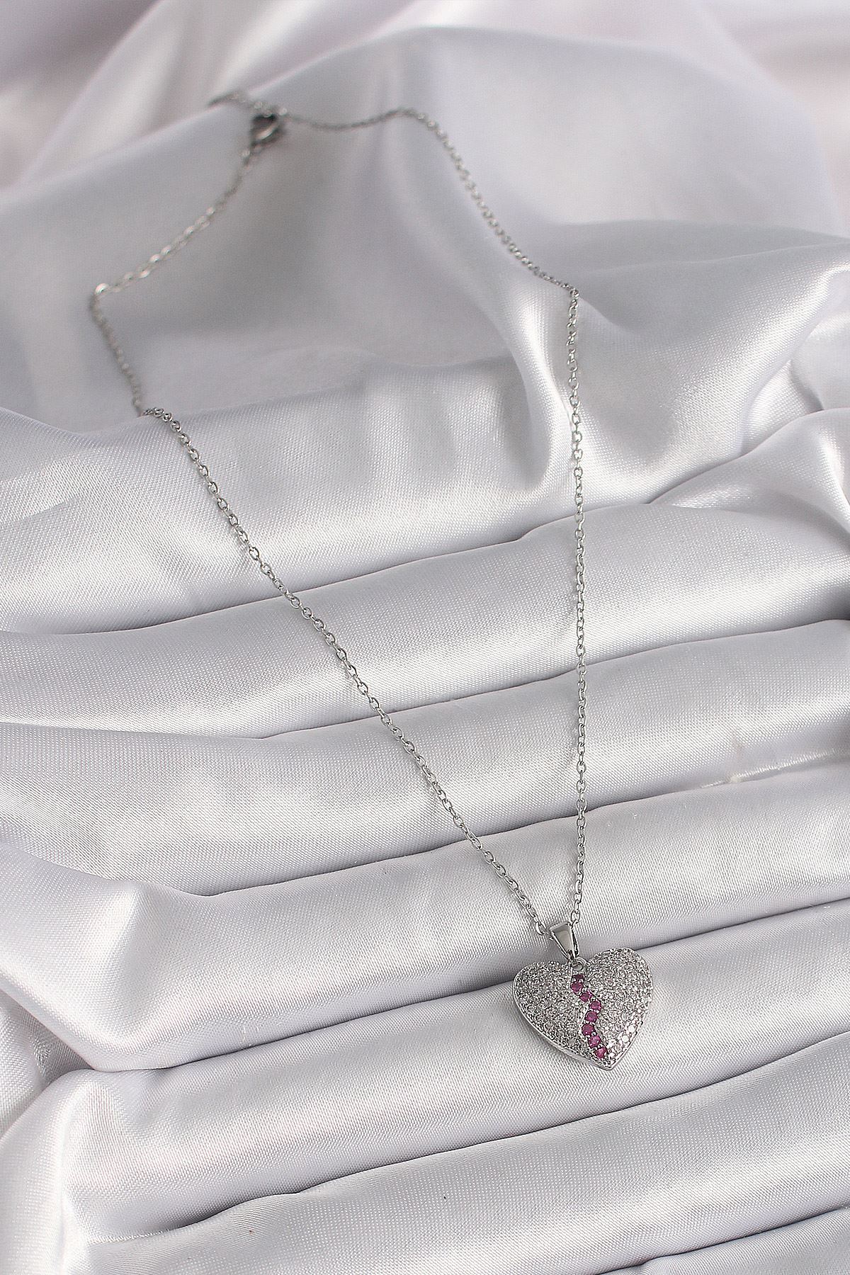 316L Çelik Gümüş Renk Zincir Zirkon Taşlı Kalp Model Kadın Kolye - TJ-BKO9645