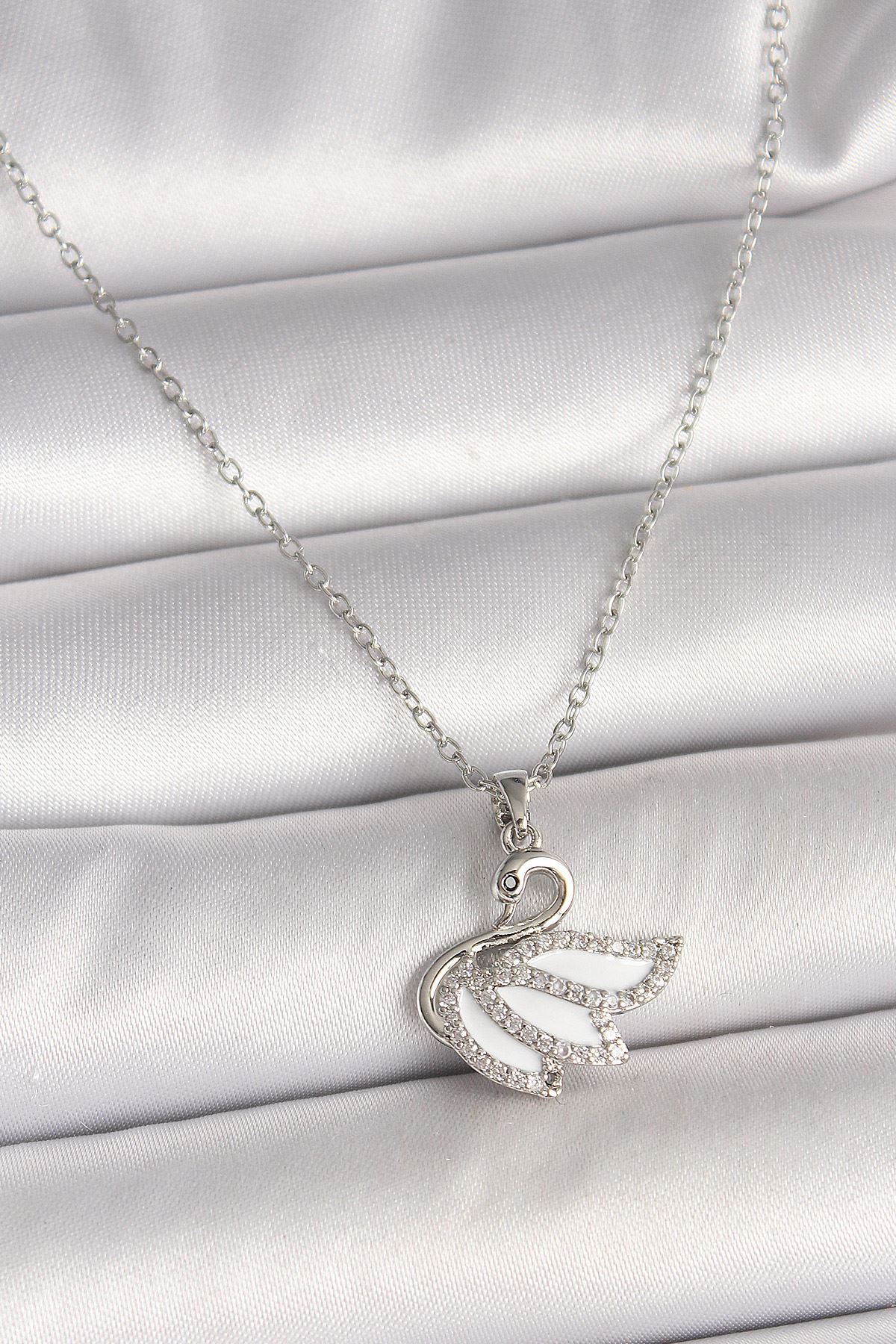 316L Çelik Gümüş Renk Zincir Zirkon Taşlı Kuğu Model Kadın Kolye - TJ-BKO9997