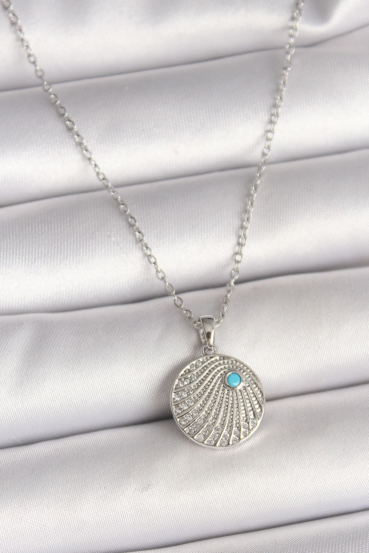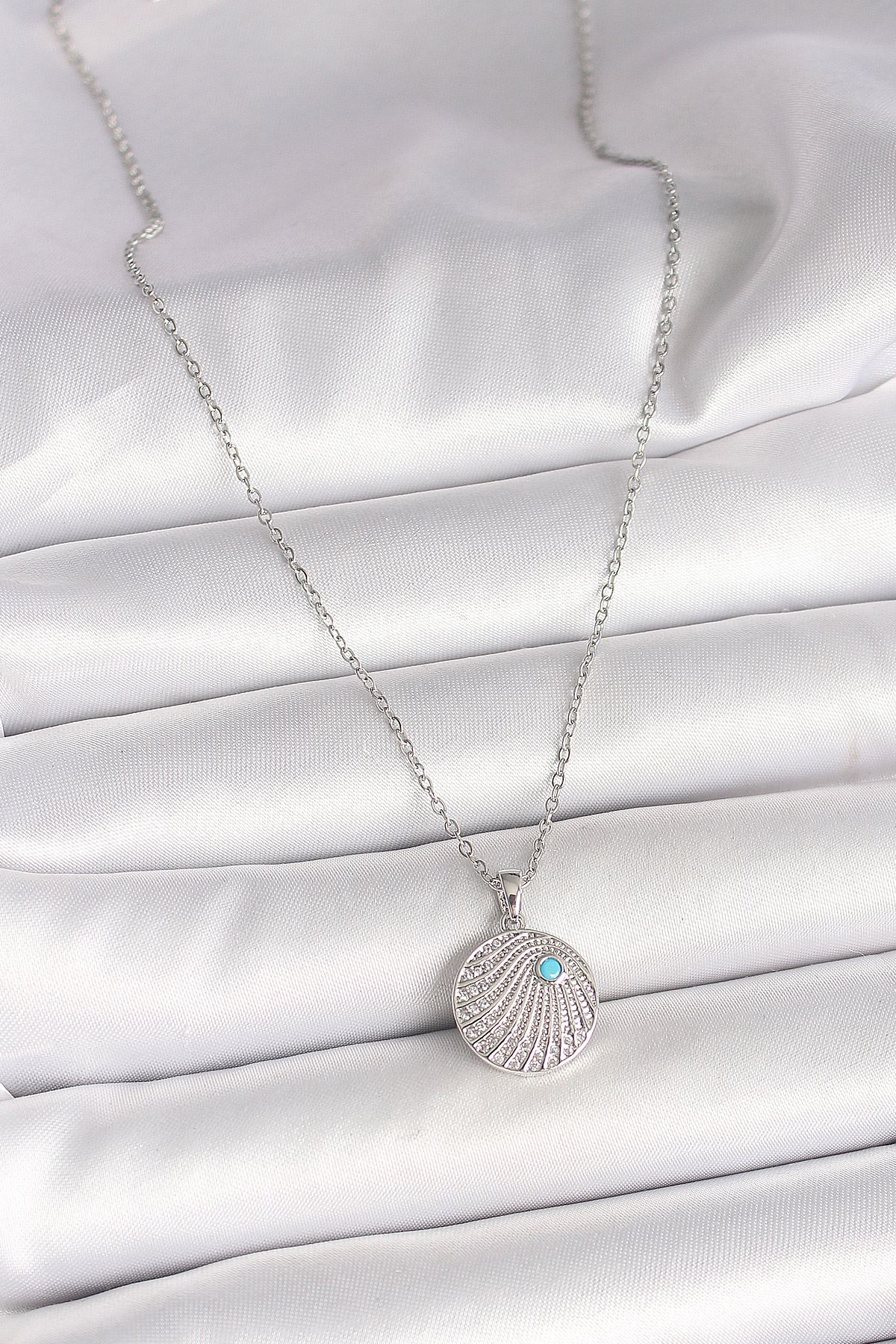 316L Çelik Gümüş Renk Zincir Zirkon Taşlı Mavi Taş Detaylı Madalyon Model Kadın Kolye - TJ-BKO9965