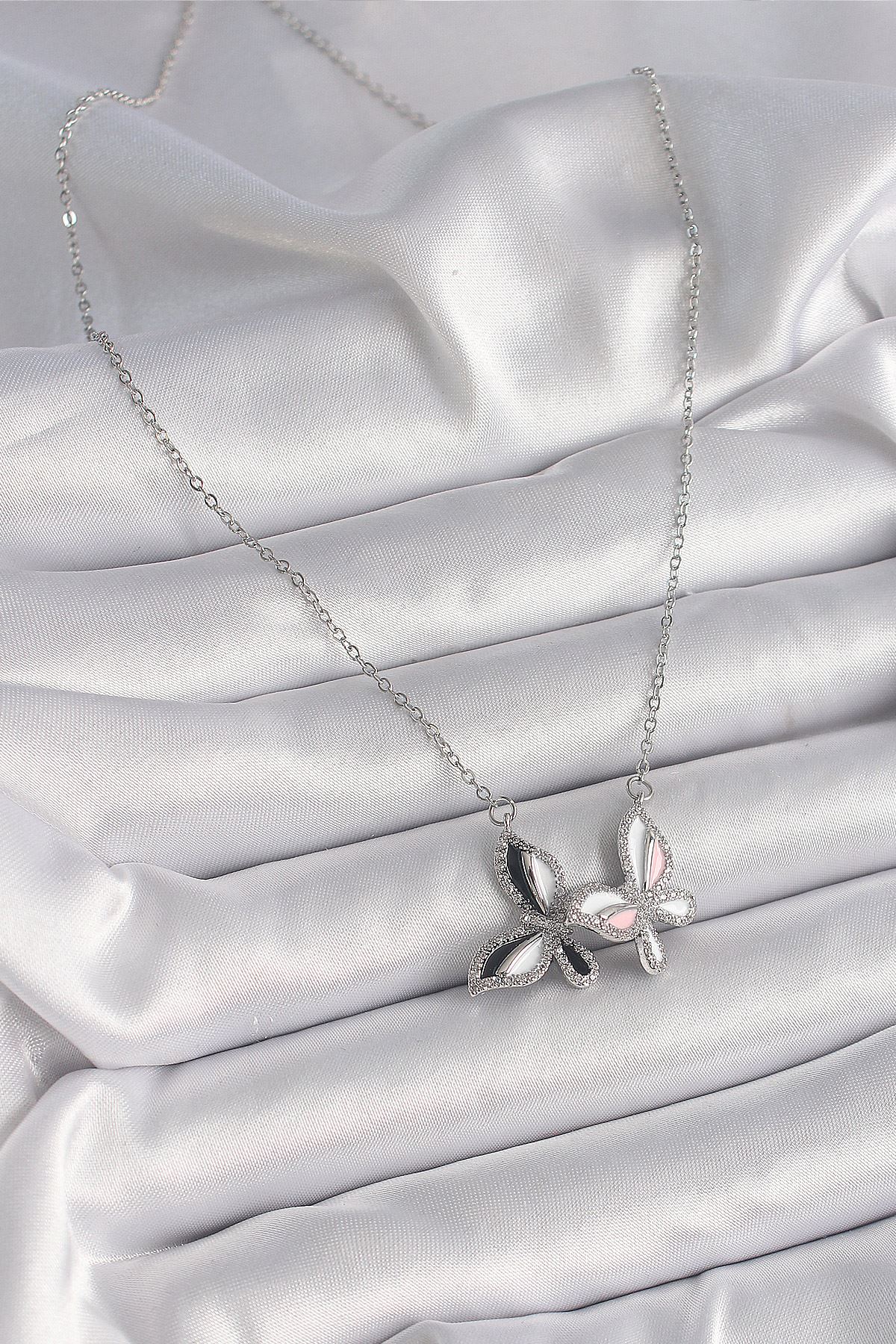 316L Çelik Gümüş Renk Zincir Zirkon Taşlı Renkli Kelebek Model Kadın Kolye - TJ-BKO9615