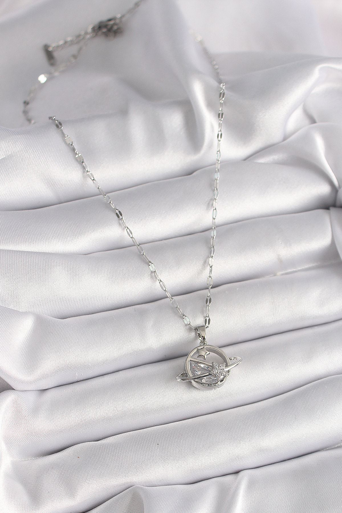 316L Çelik Gümüş Renk Zincir Zirkon Taşlı Yıldız Detay Gezegen Model Kadın Kolye - TJ-BKO9643