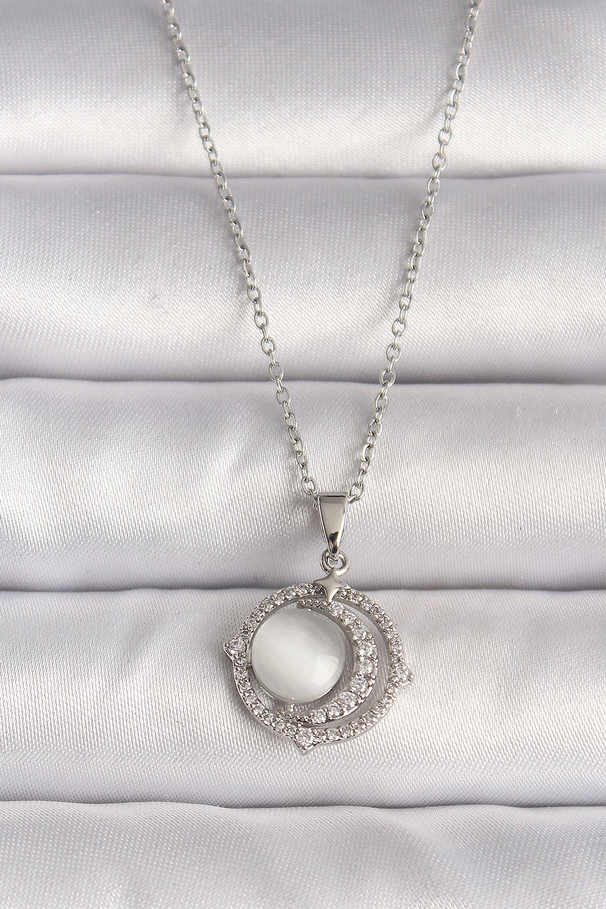316L Çelik Gümüş Renk Zirkon Taşlı Beyaz Sedefli Hilal Model Kadın Kolye - TJ-BKO9702