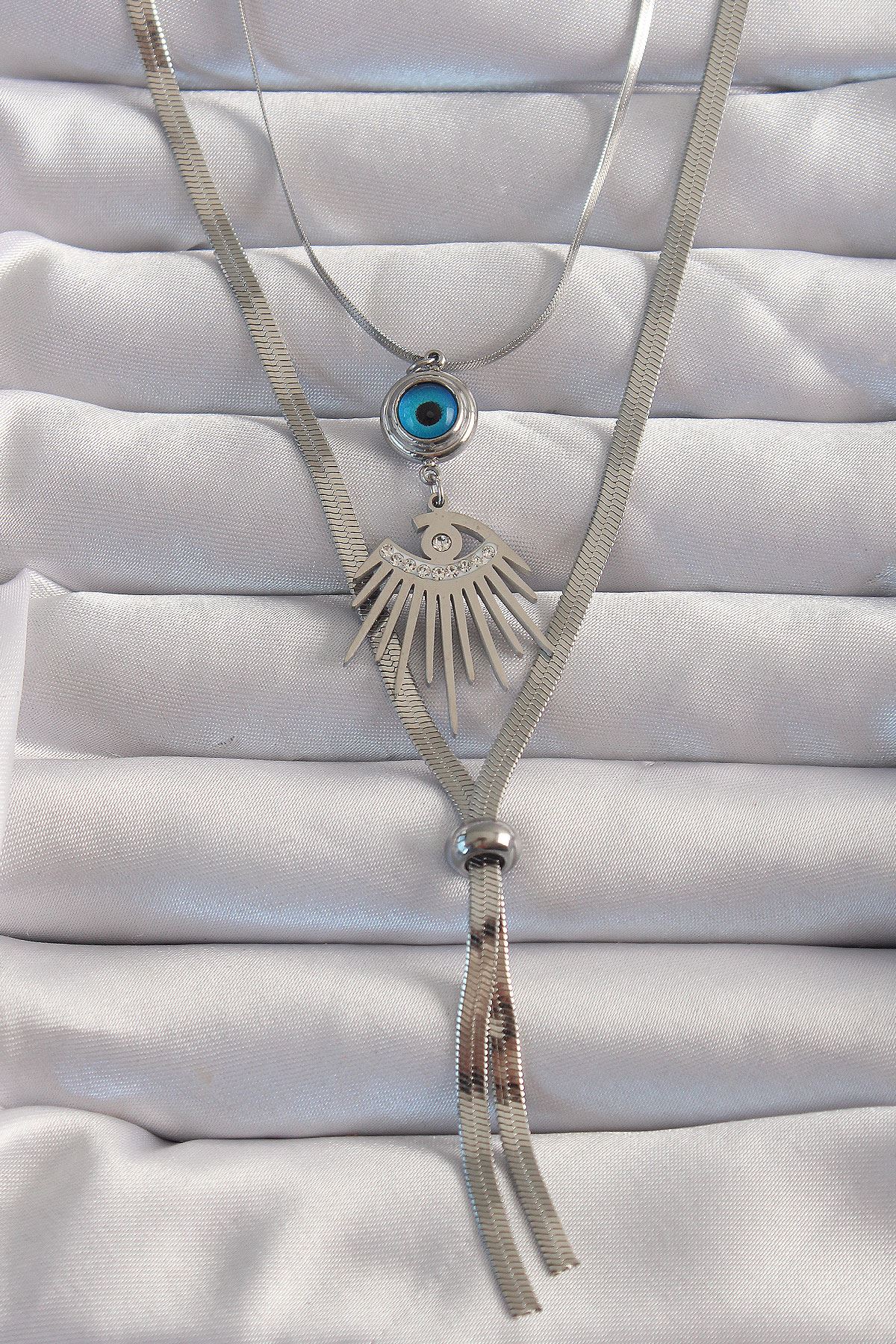 316L Çelik Gümüş Renk Zirkon Taşlı Göz Detay Nazarlı Uzun Asansör Model Kolye - TJ-BKO8961