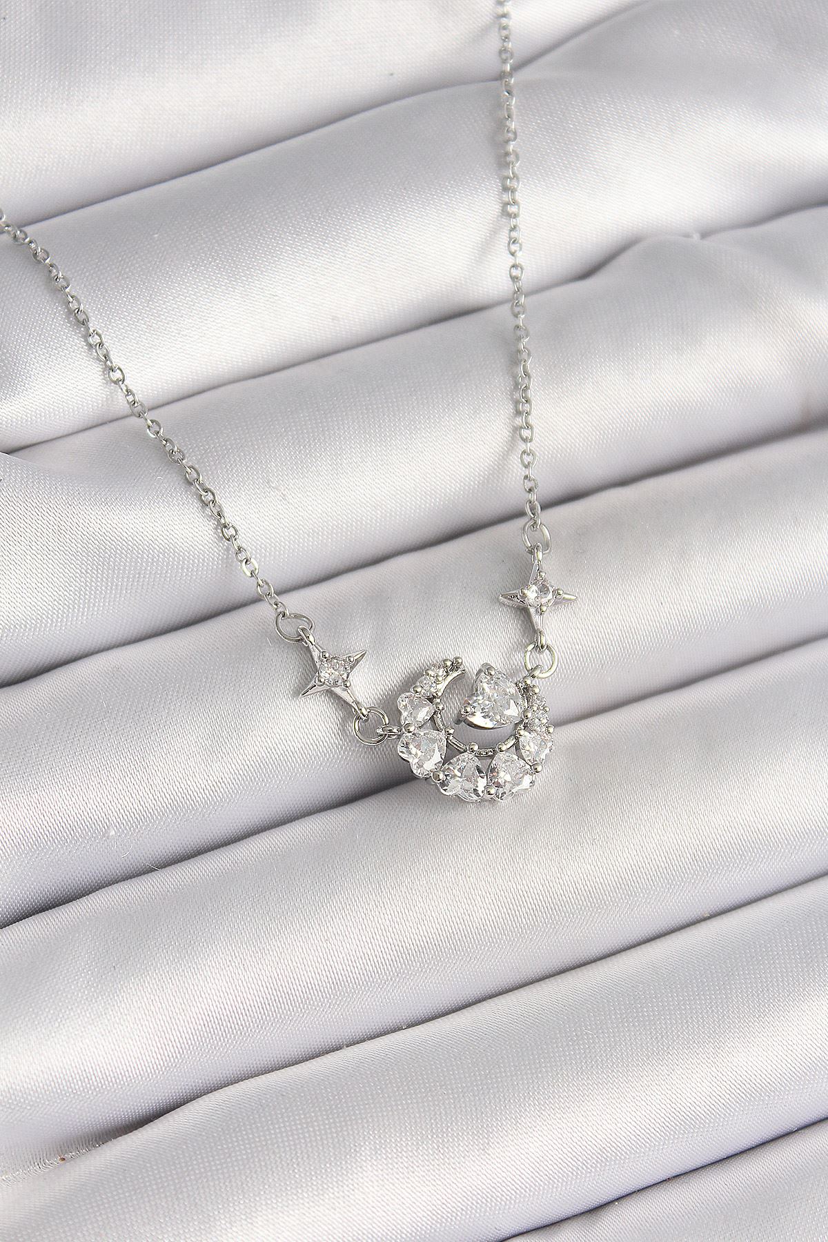 316L Çelik Gümüş Renk Zirkon Taşlı Hilal Kalp Model Kadın Kolye - TJ-BKO9929
