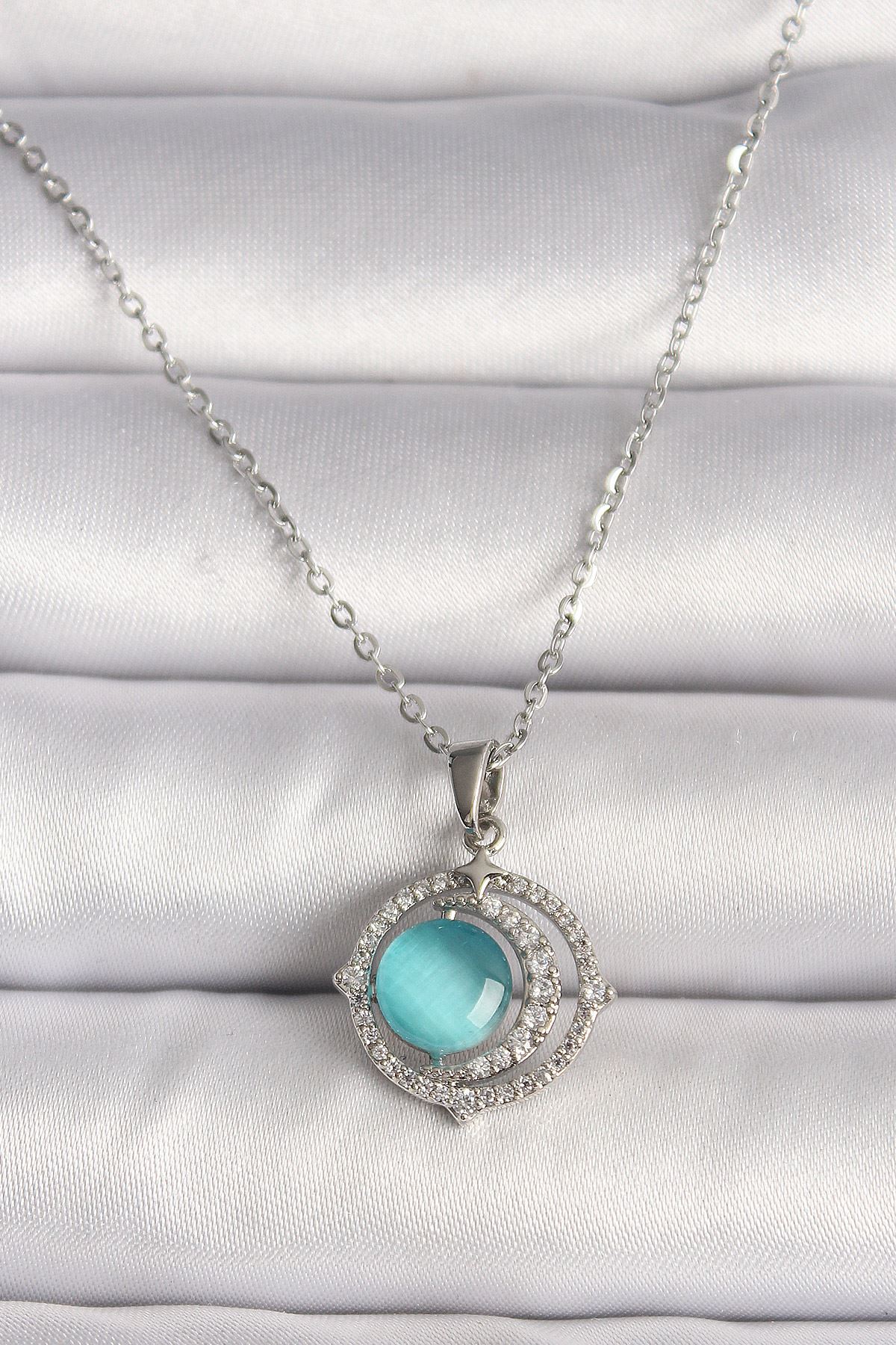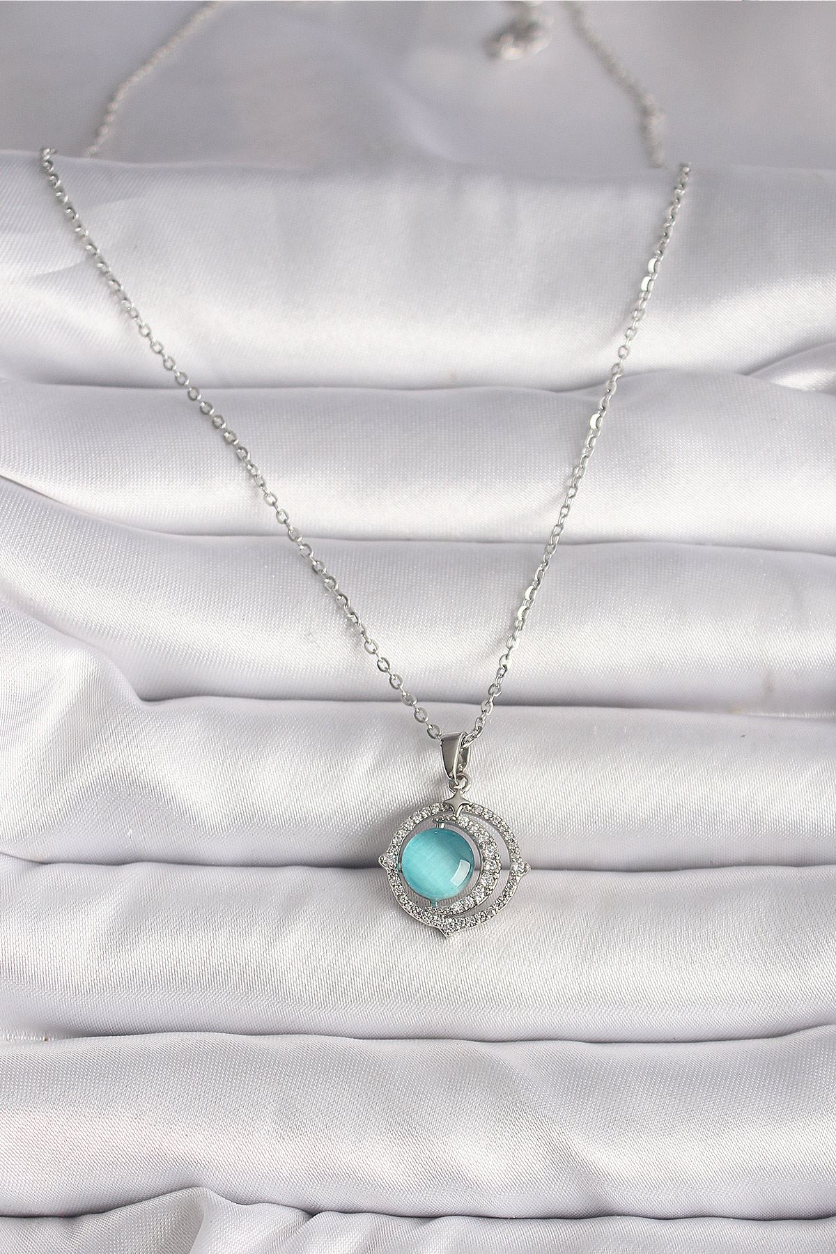 316L Çelik Gümüş Renk Zirkon Taşlı Mavi Sedefli Hilal Model Kadın Kolye - TJ-BKO9703