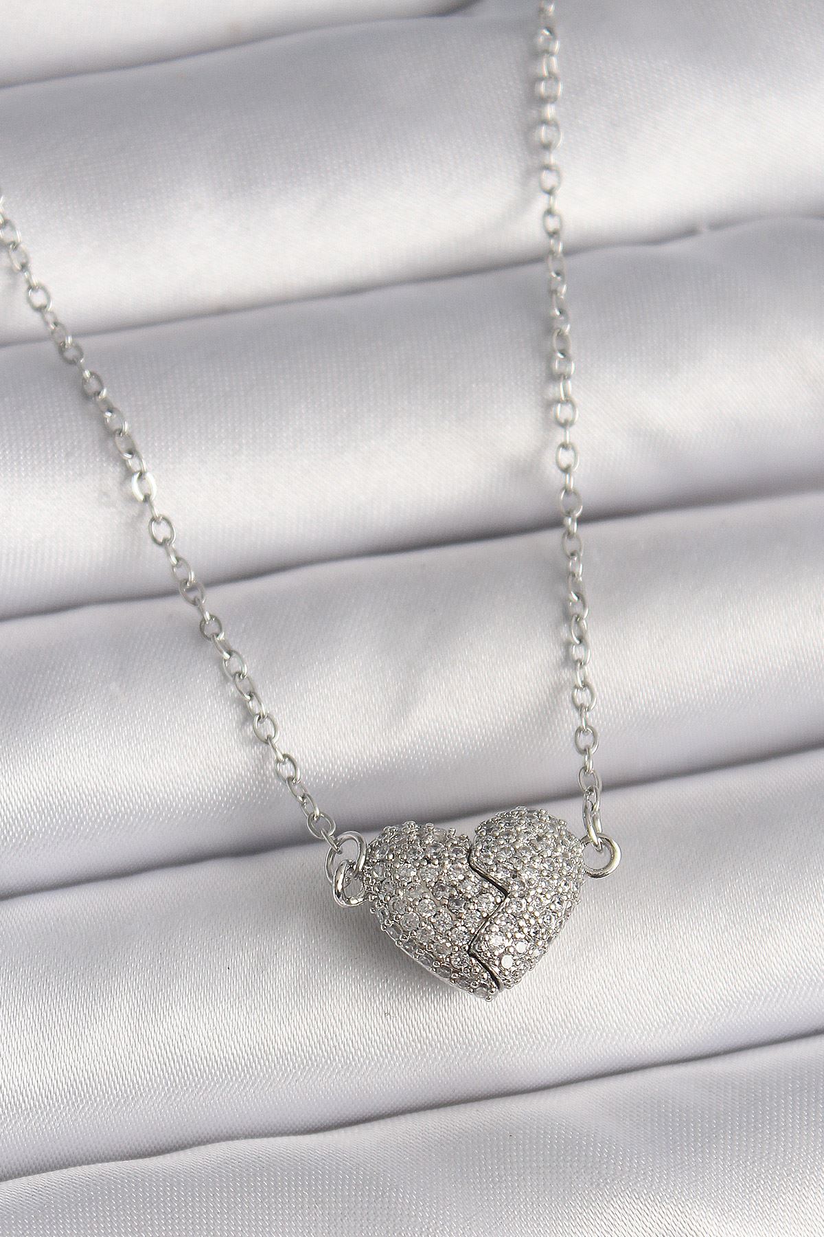 316L Çelik Gümüş Renk Zirkon Taşlı Mıknatıslı Kalp Model Kadın Kolye - TJ-BKO9727