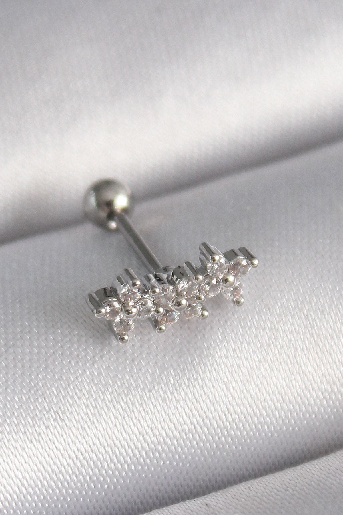 316L Çelik Gümüş Renk Zirkon Taşlı Yonca Tragus Piercing - TJ-PR1255