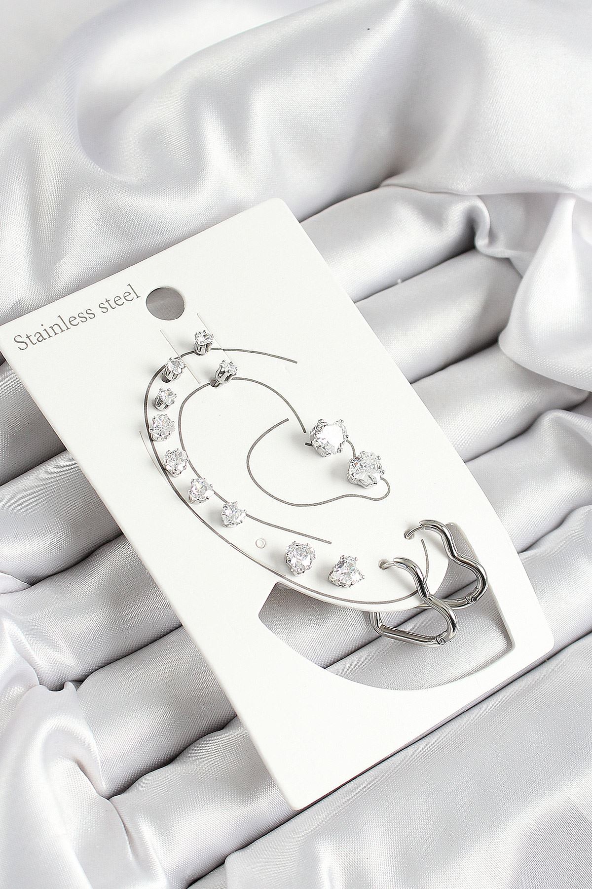 316L Çelik Kalp Figürlü Ve Zirkon Taşlı Gümüş Renk 7'li Çift Kadın Küpe Set - TJ-BKP10639