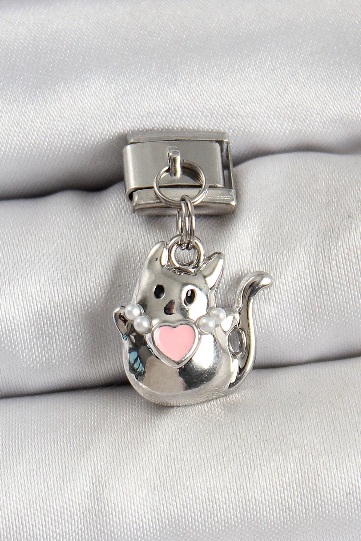 316L Çelik Sallantılı Kalp Detaylı Kedi Model Gümüş Renk Nomination Charm - TJ-BC1460