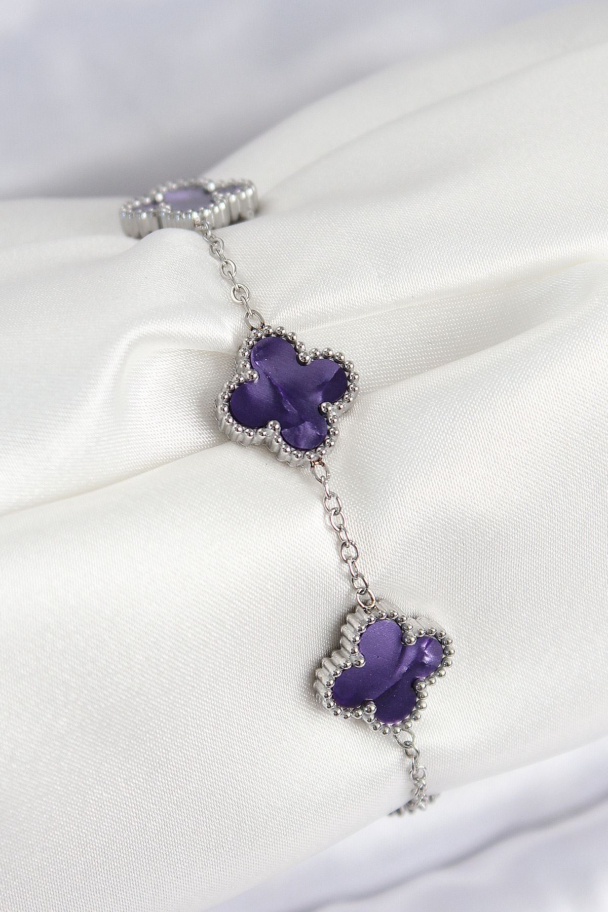 316L Çelik Sedefli Mor Gümüş Renk Yonca Kadın Bileklik - TJ-BB7674
