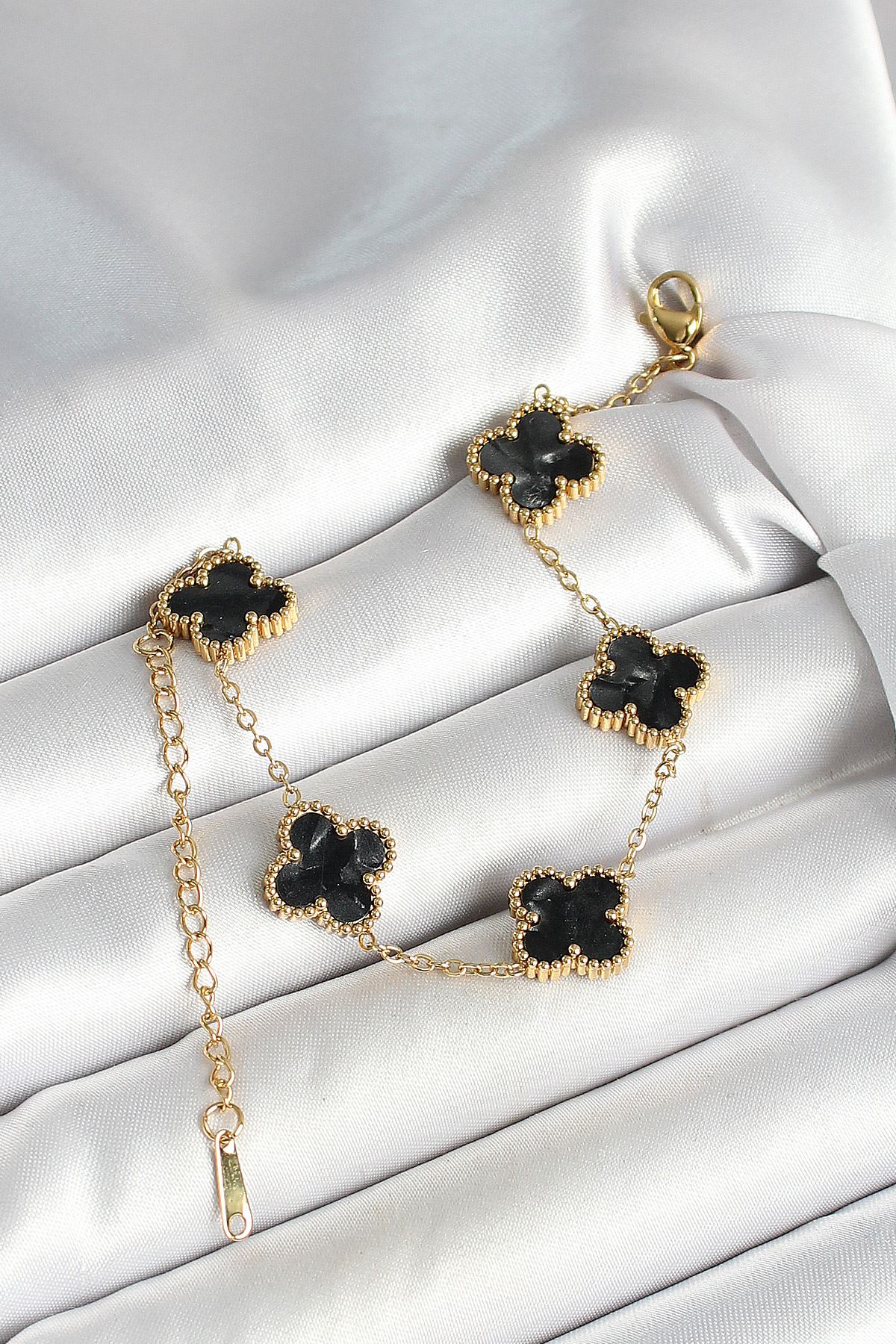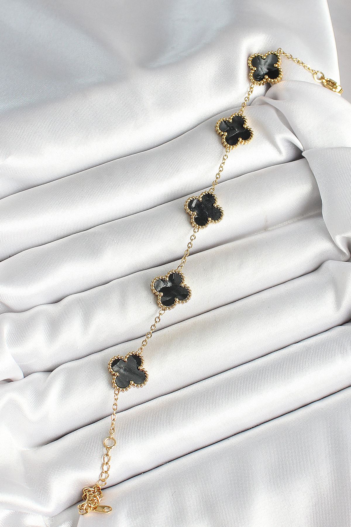 316L Çelik Sedefli Siyah Gold Renk Yonca Kadın Bileklik - TJ-BB6969