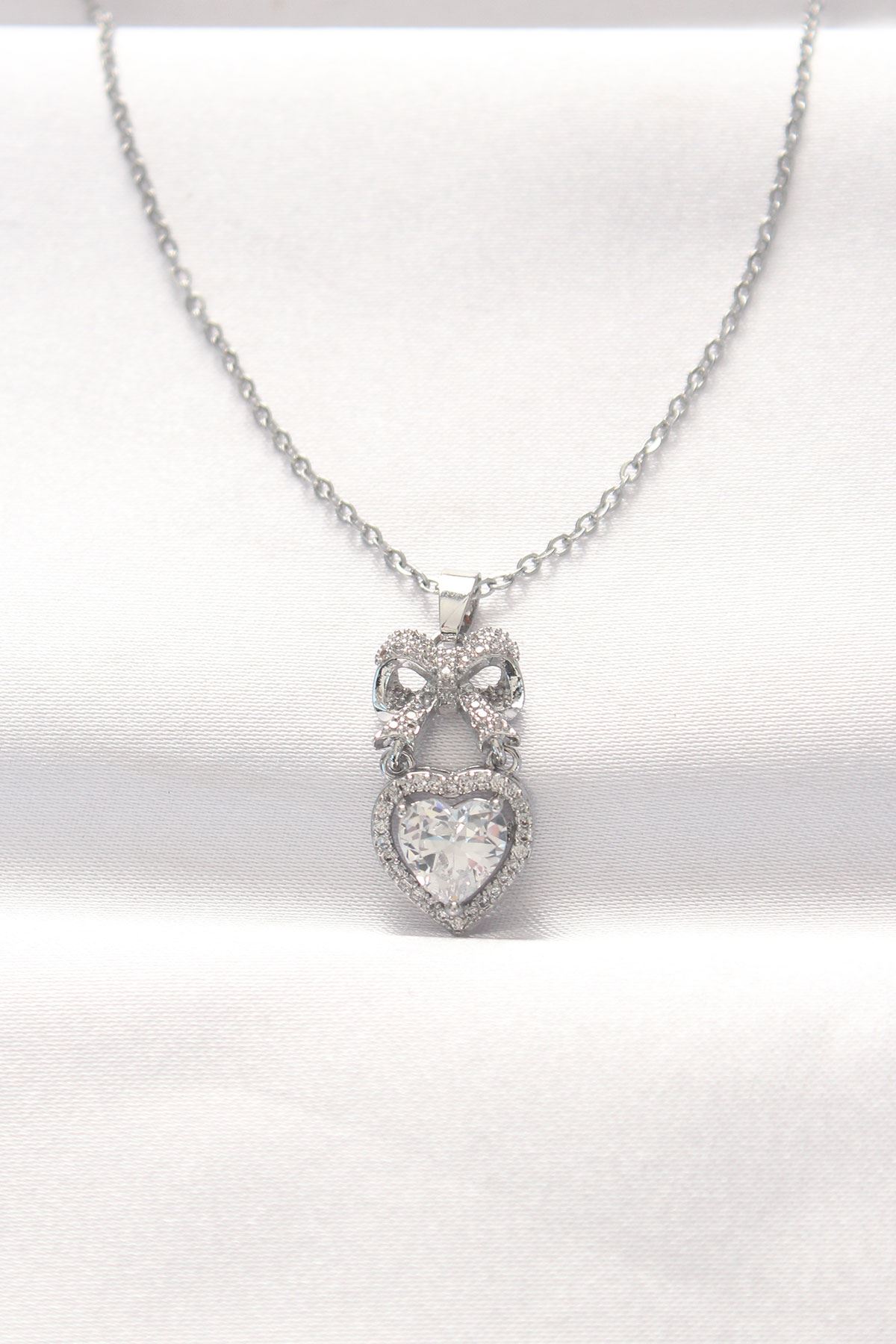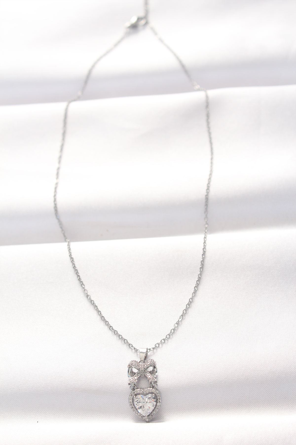 316L Çelik Silver Renk Zirkon Taşlı Kalpli Fiyonk Kolye - TJ-BKO8519
