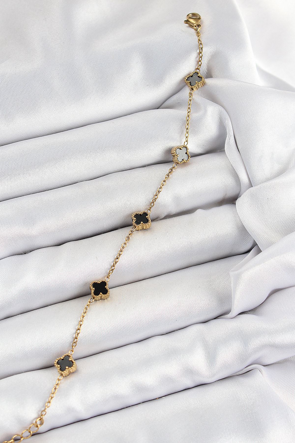 316L Çelik Siyah Sedef Yonca Model Gold Renk Kadın Bileklik - TJ-BB7359