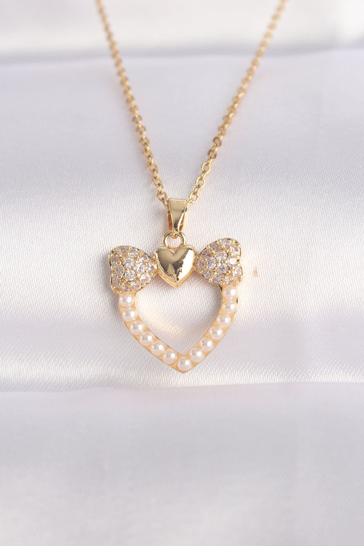 316L Çelik Zincir Altın Renk İnci Taş Detay Zirkon Taşlı Kalp Kolye - TJ-BKO8630