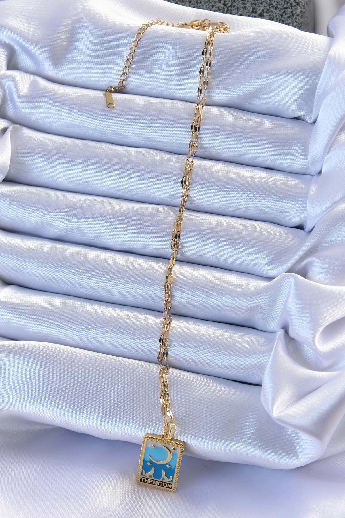 316L Çelik Zincir Altın Renk Mavi Mineli Ay Figür Tarot Kolye - TJ-BKO9213