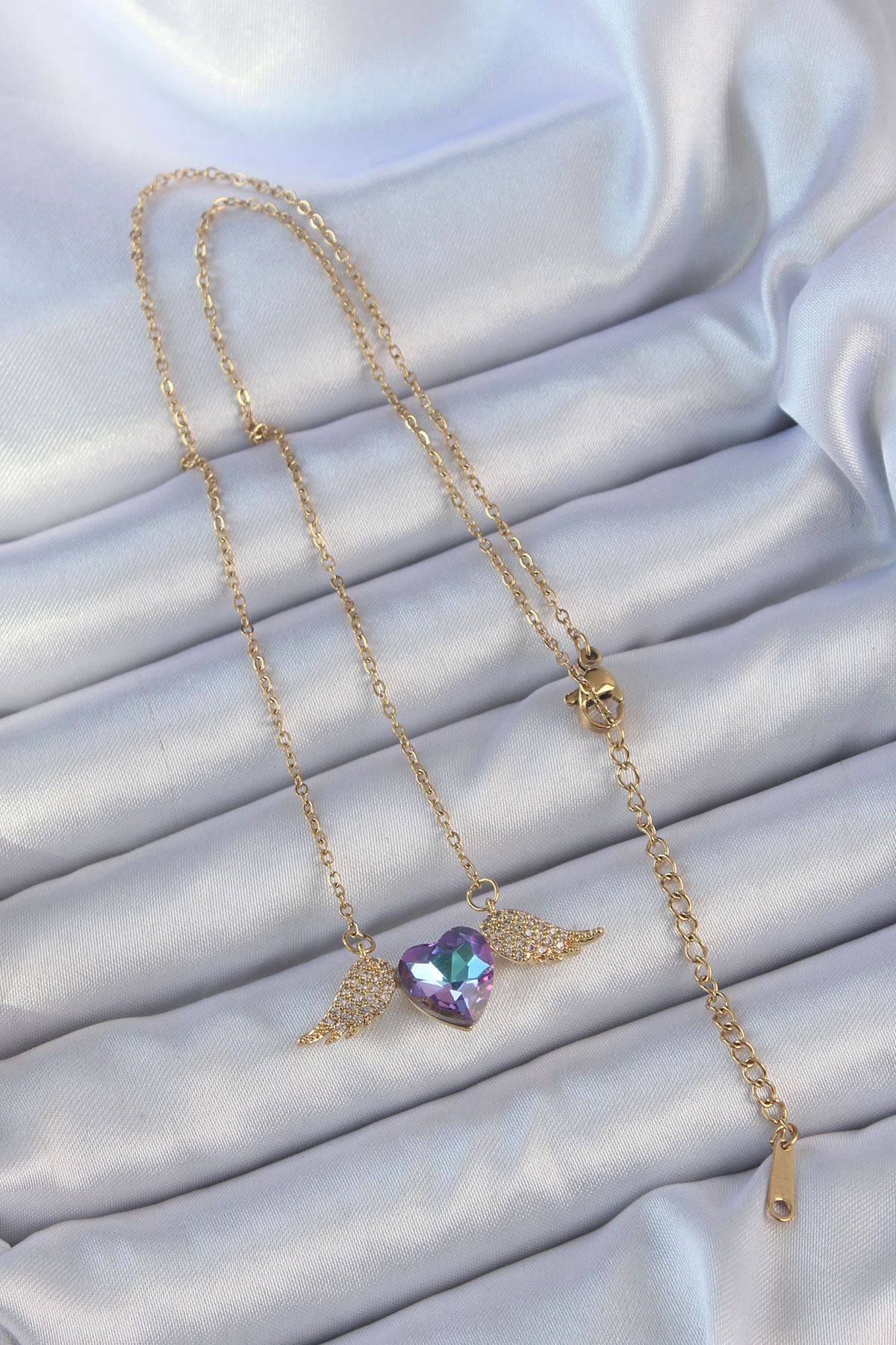 316L Çelik Zincir Altın Renk Mavi Mor Zirkon Taşlı Kanatlı Kalp Kolye - TJ-BKO9161