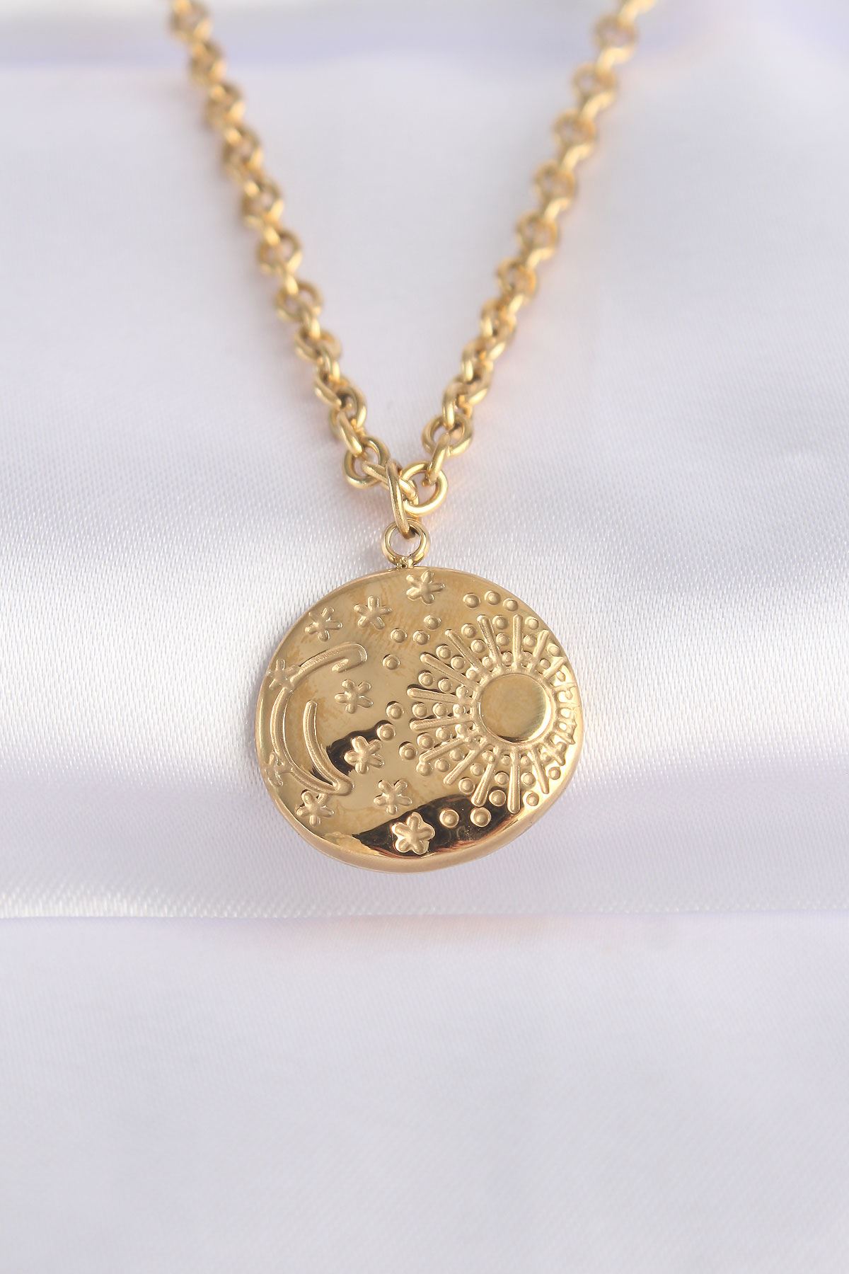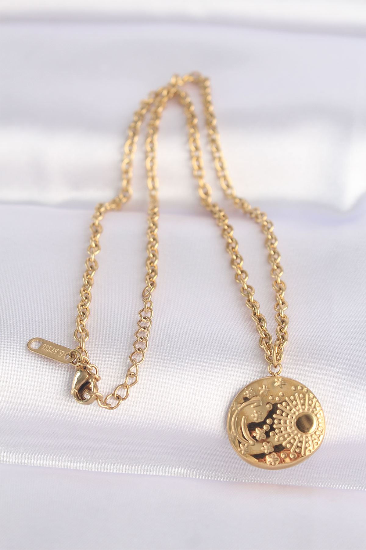 316L Çelik Zincir Altın Renk Zirkon Taşlı Oval Tasarım Güneş Kolye - TJ-BKO8653