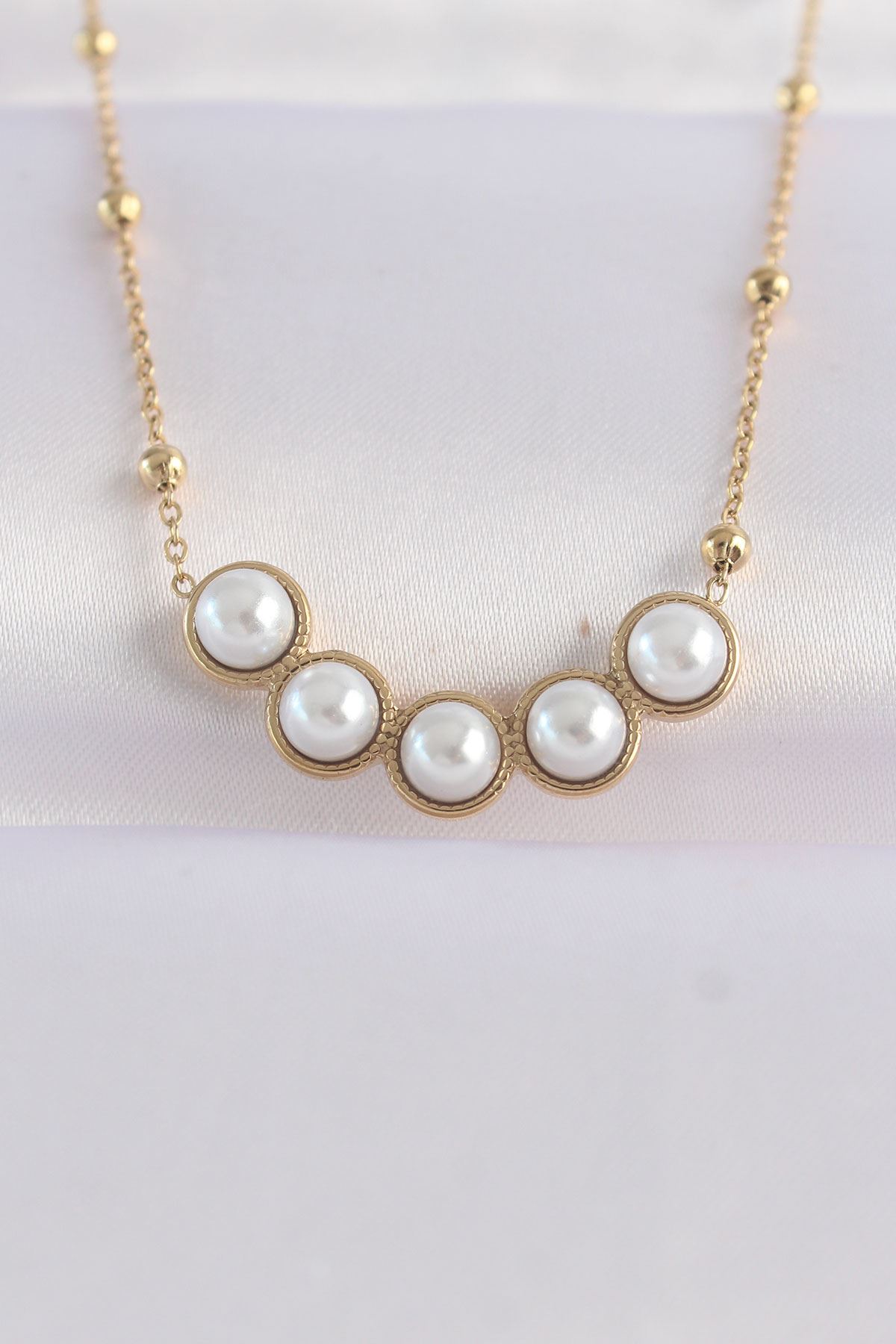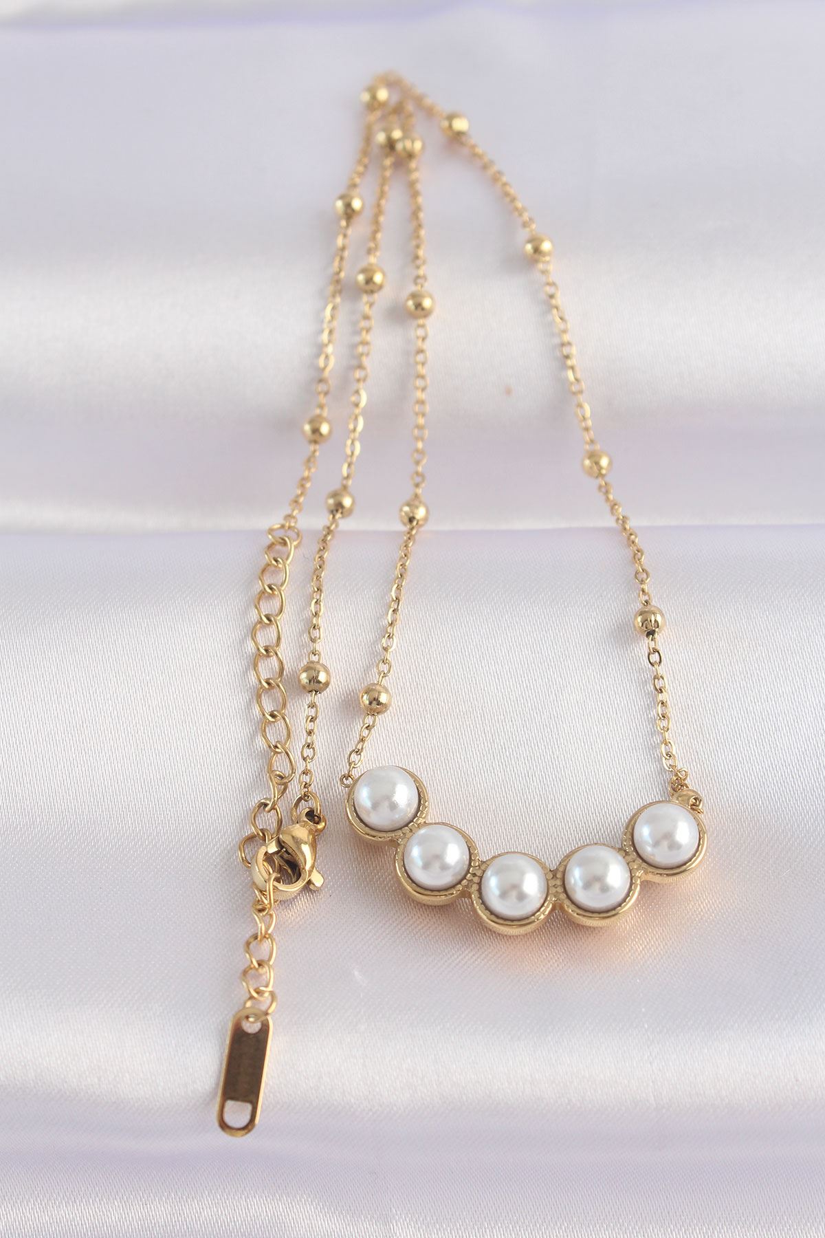316L Çelik Zincir Altın Renk Sıralı İnci Taşlı Kolye - TJ-BKO8655
