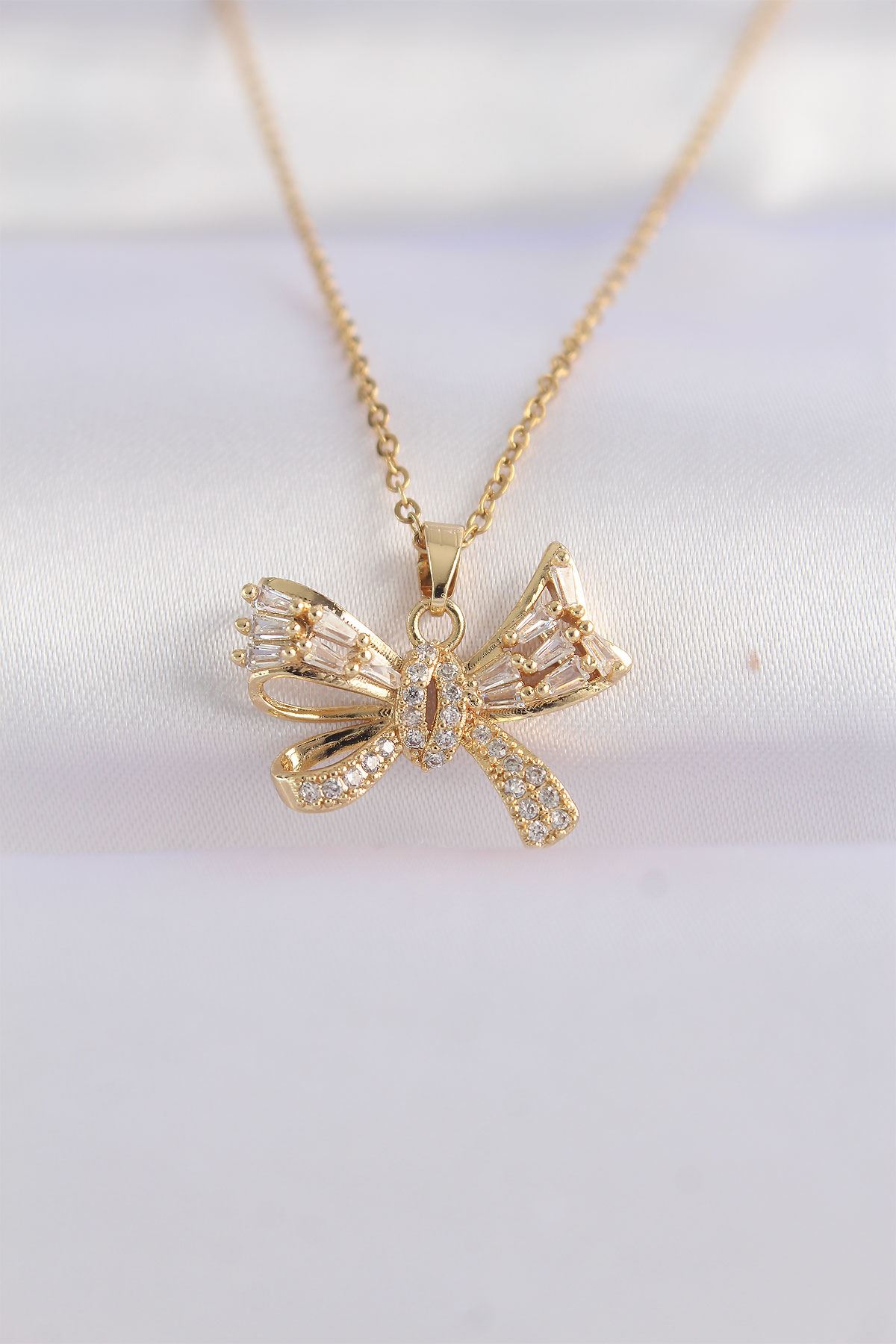 316L Çelik Zincir Altın Renk Zirkon Taşlı Fiyonk Kolye - TJ-BKO8652
