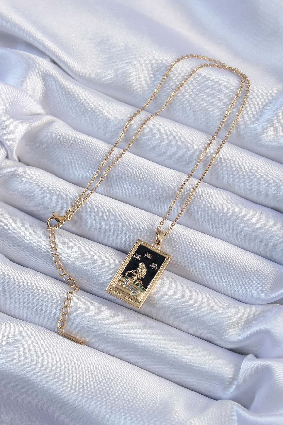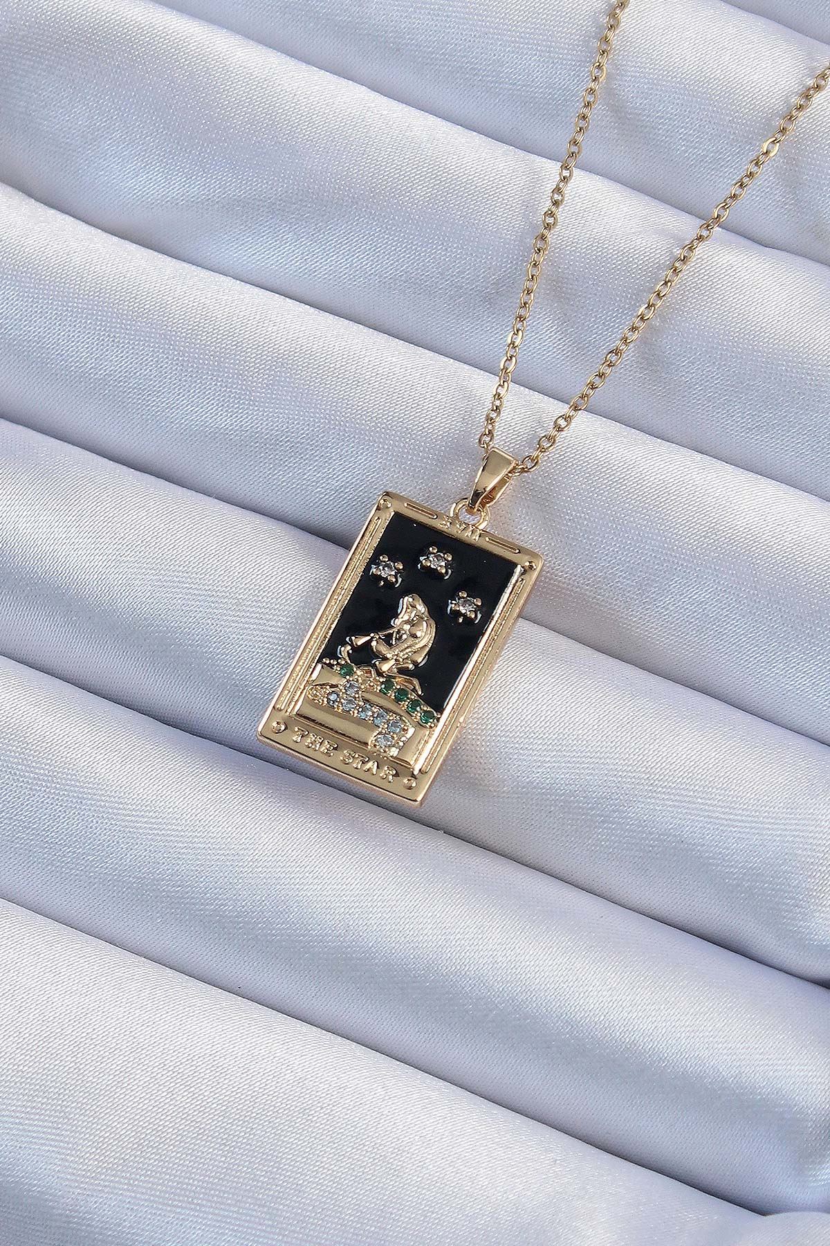 316L Çelik Zincir Altın Renk Zirkon Taşlı Siyah Mineli Kız Figürlü Tarot Kolye - TJ-BKO9227