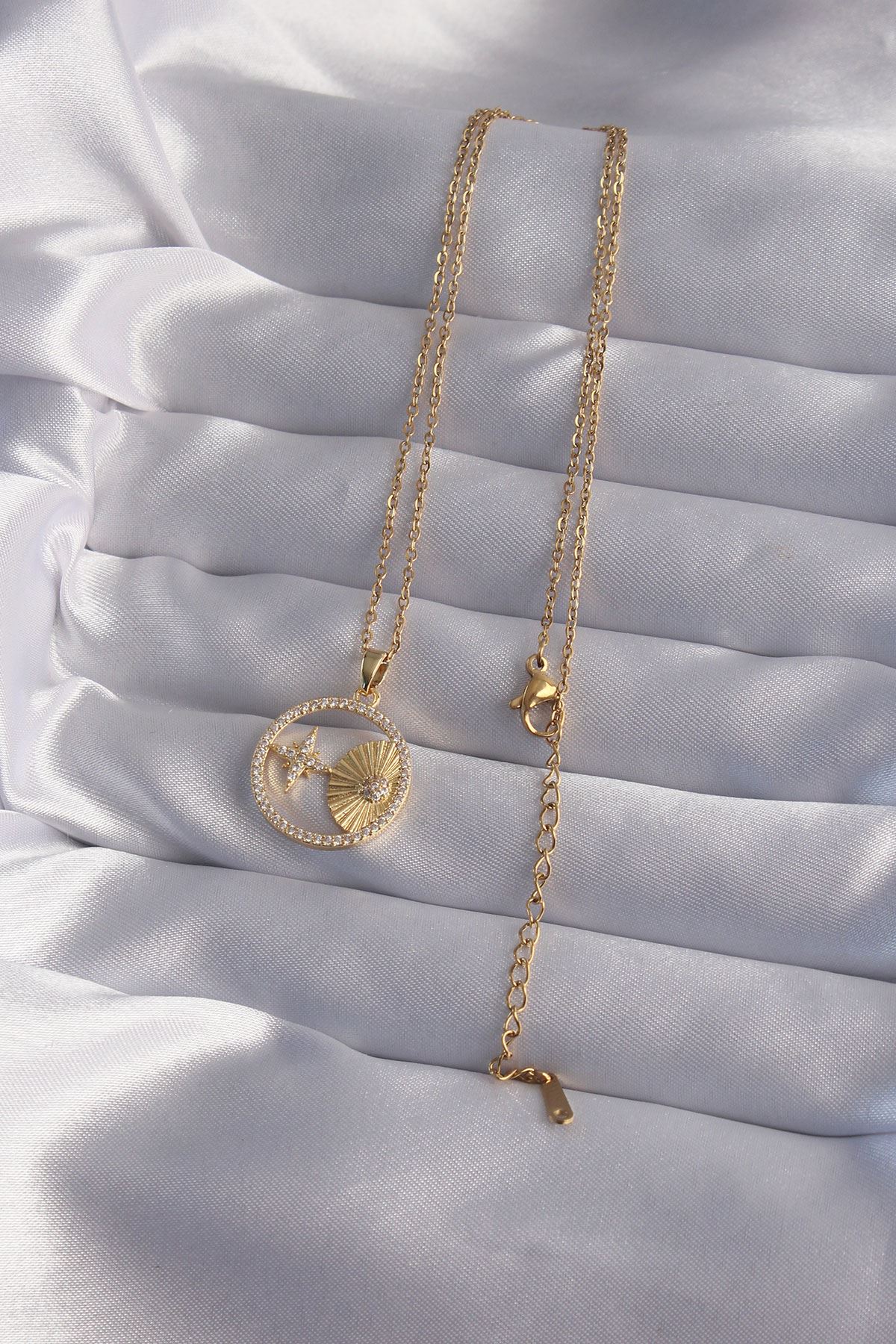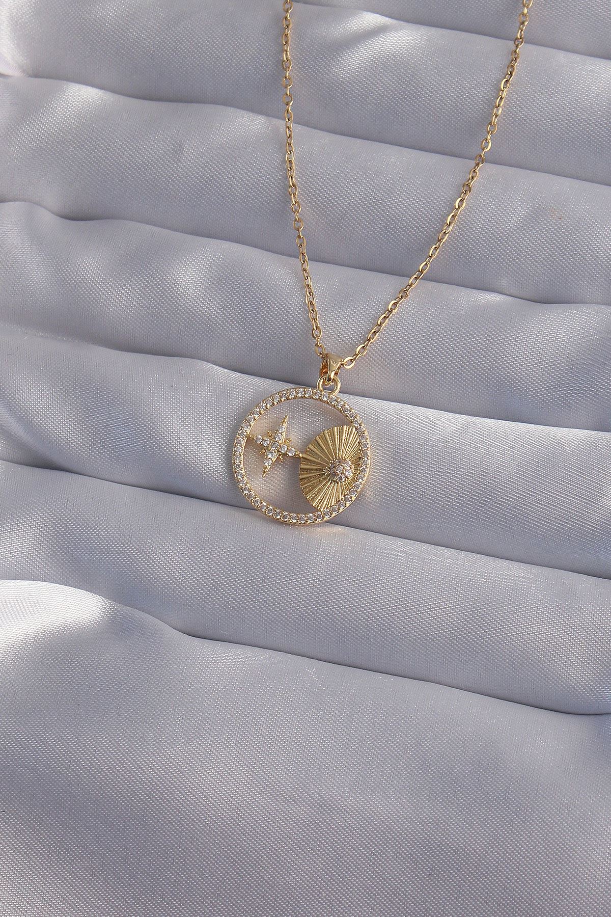 316L Çelik Zincir Gold Renk Zirkon Taşlı Yıldız Figürlü Oval Kolye - TJ-BKO9023