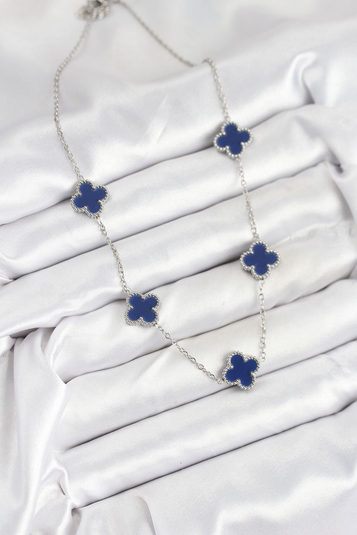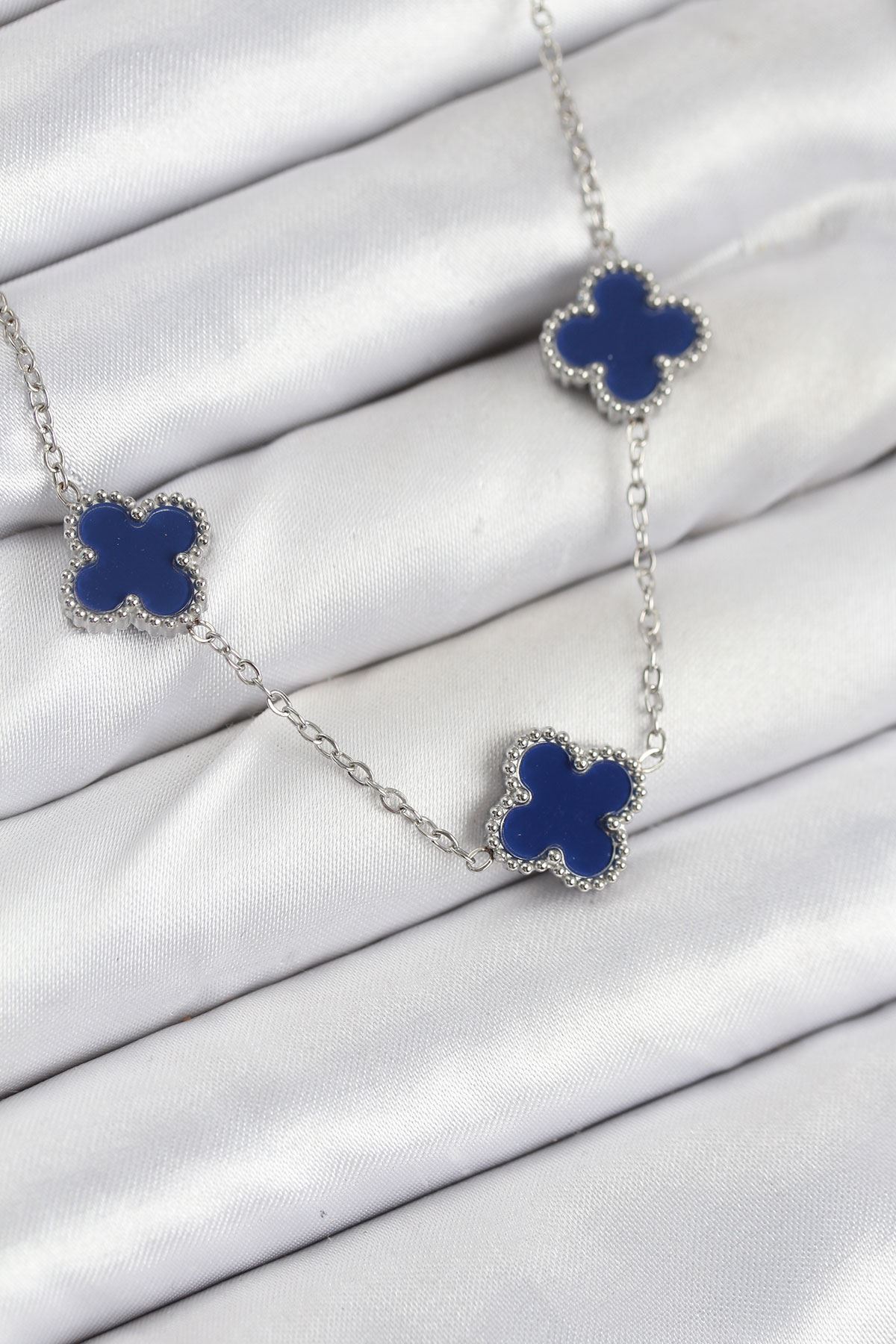 316L Çelik Zincir Gümüş Lacivert Renk Yonca Kadın Kolye - TJ-BKO10587