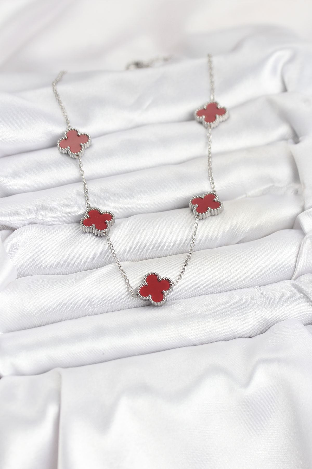 316L Çelik Zincir Gümüş Renk Bordo Renk Yonca Kadın Kolye - TJ-BKO10569
