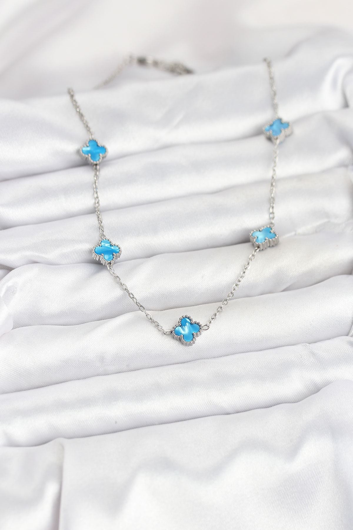 316L Çelik Zincir Gümüş Renk Buz Mavisi Baby Boy Yonca Kadın Kolye - TJ-BKO10576