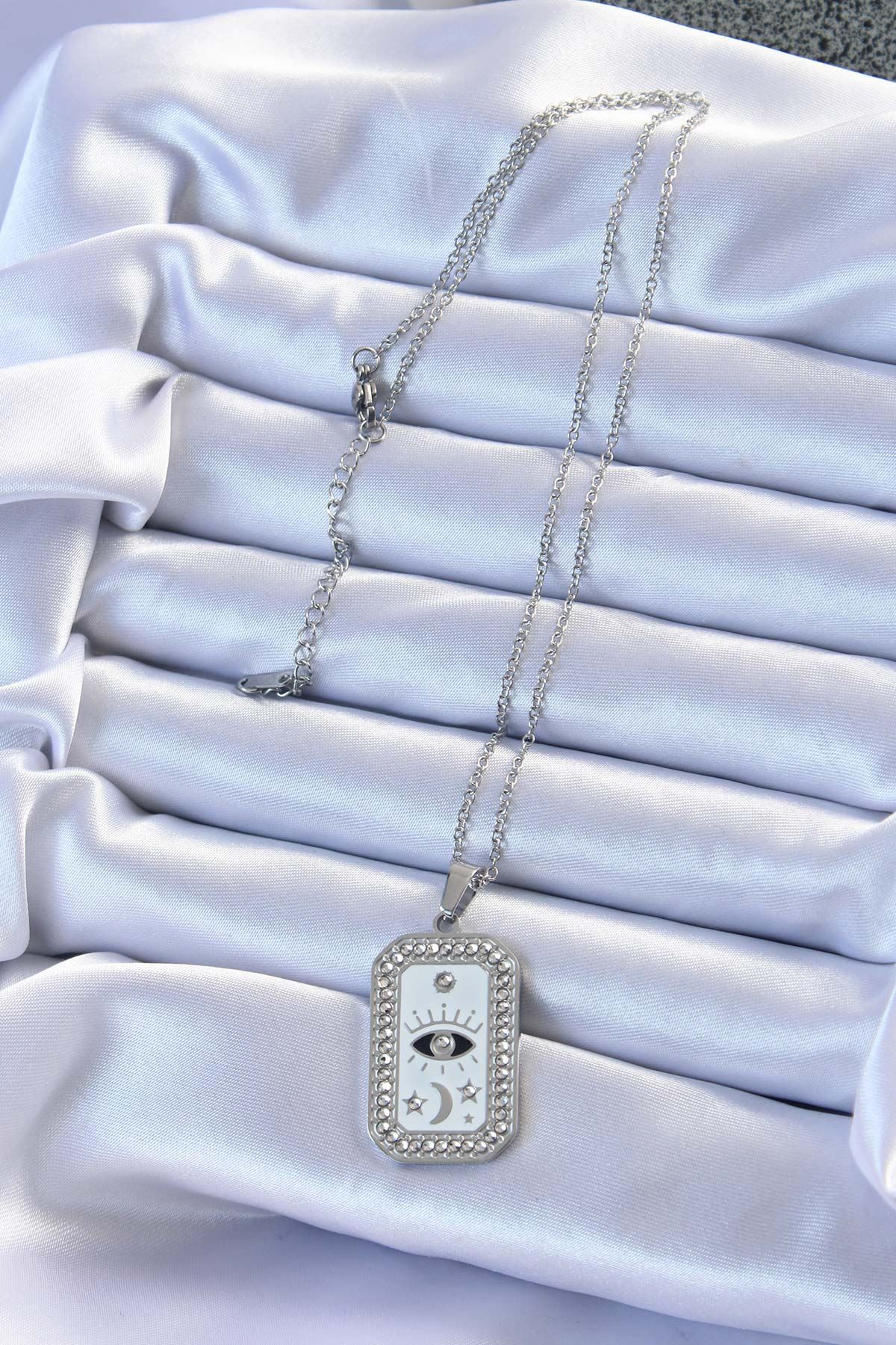 316L Çelik Zincir Gümüş Renk Mineli Zirkon Taşlı Göz Figür Tarot Kolye - TJ-BKO9214