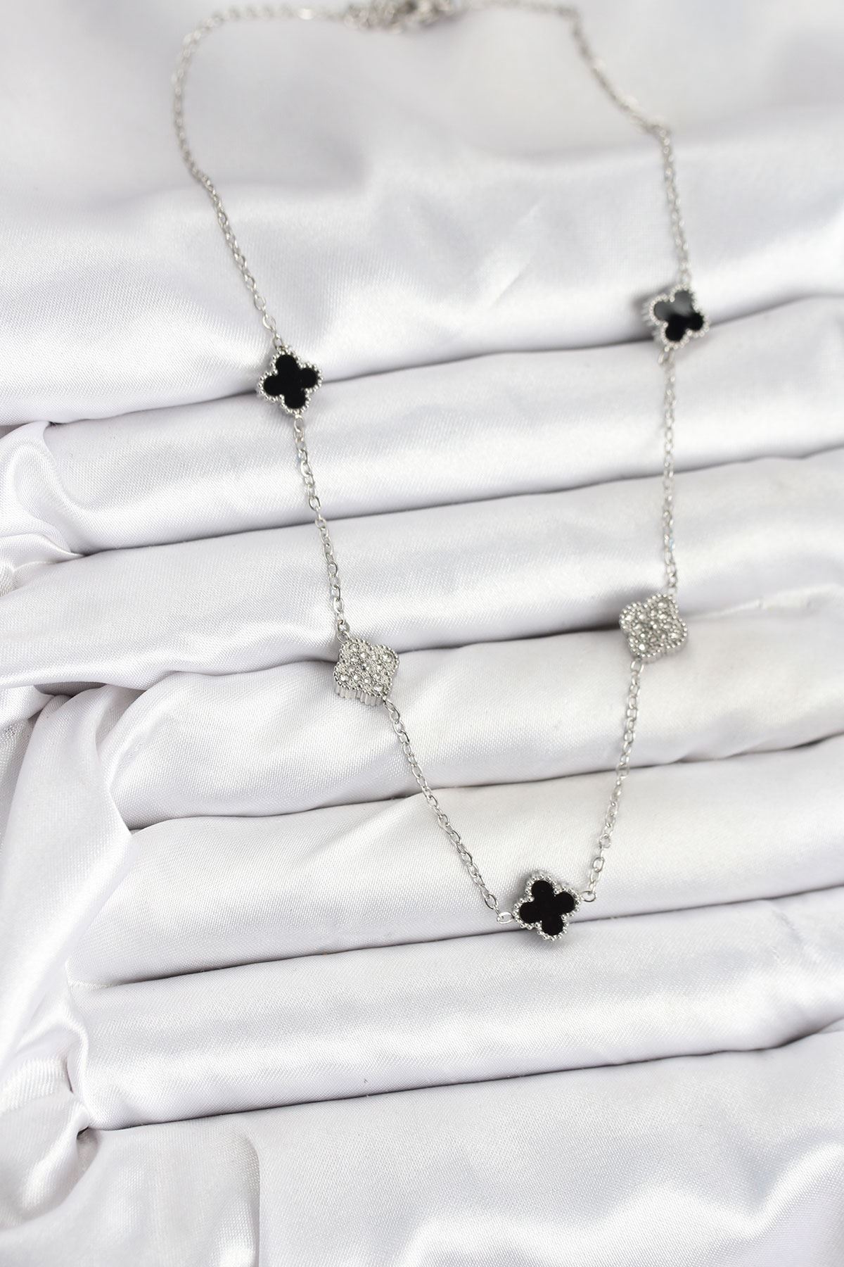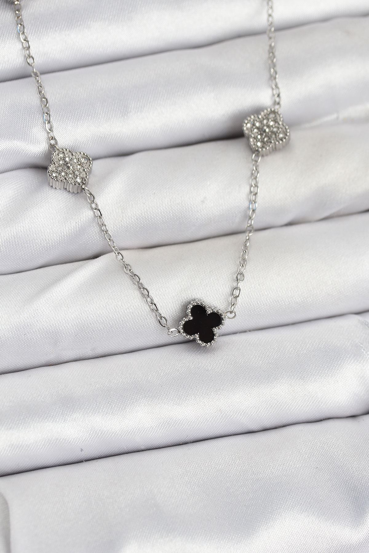 316L Çelik Zincir Gümüş Renk Siyah ve Zirkon Taşlı Baby Boy Yonca Kadın Kolye - TJ-BKO10591