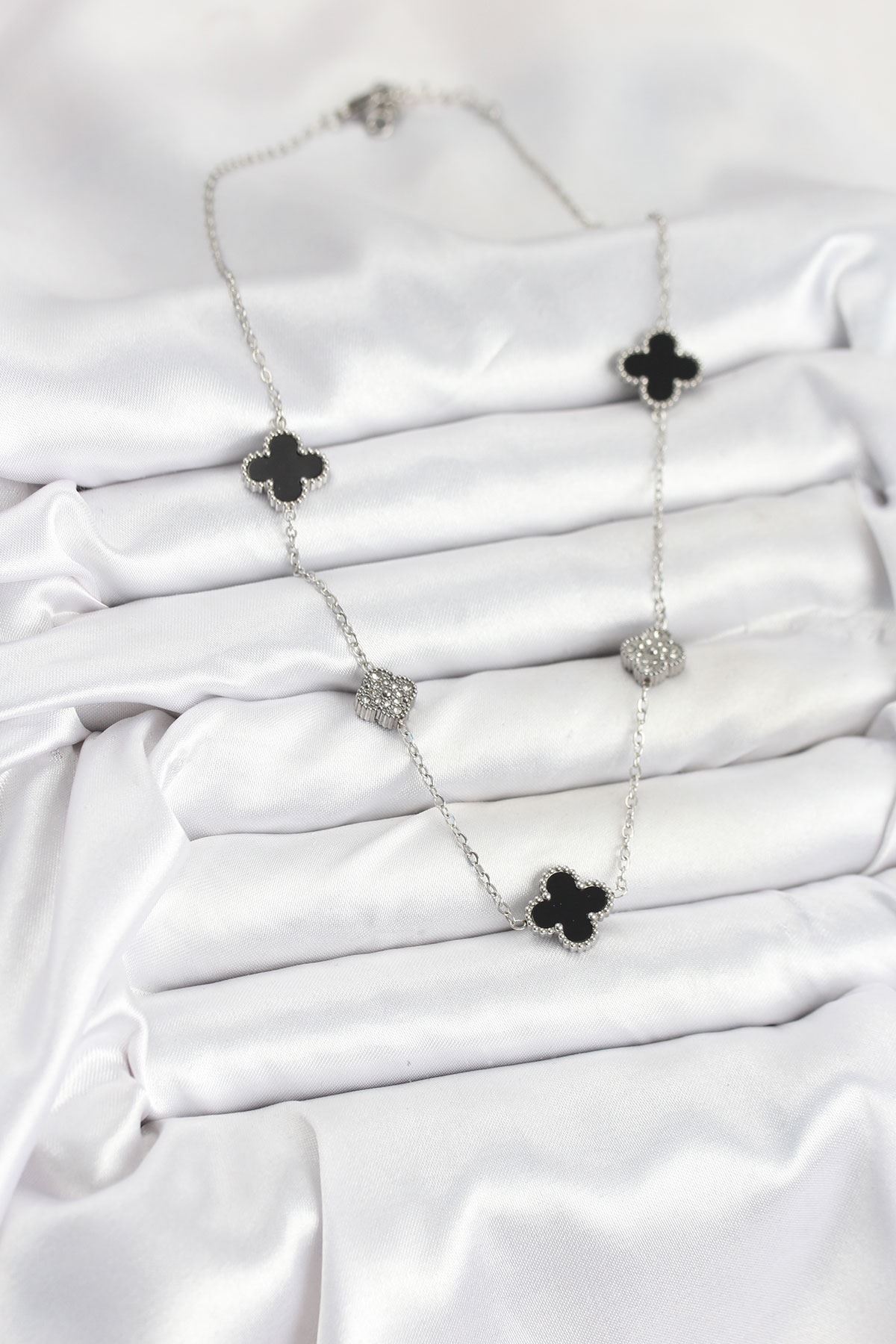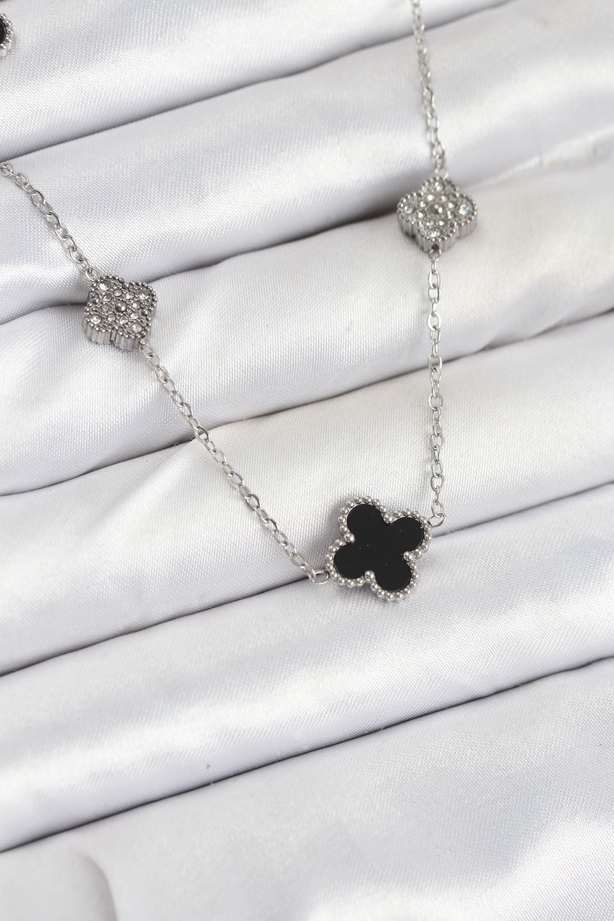 316L Çelik Zincir Gümüş Renk Siyah ve Zirkon Taşlı Yonca Kadın Kolye - TJ-BKO10589