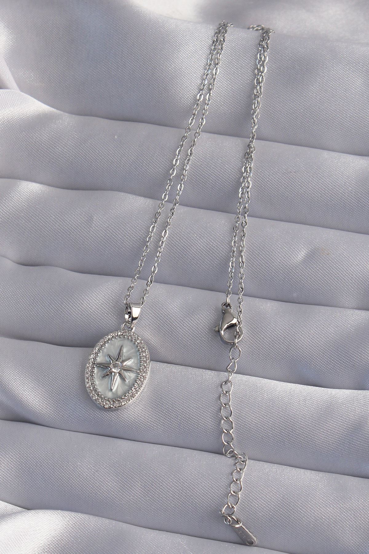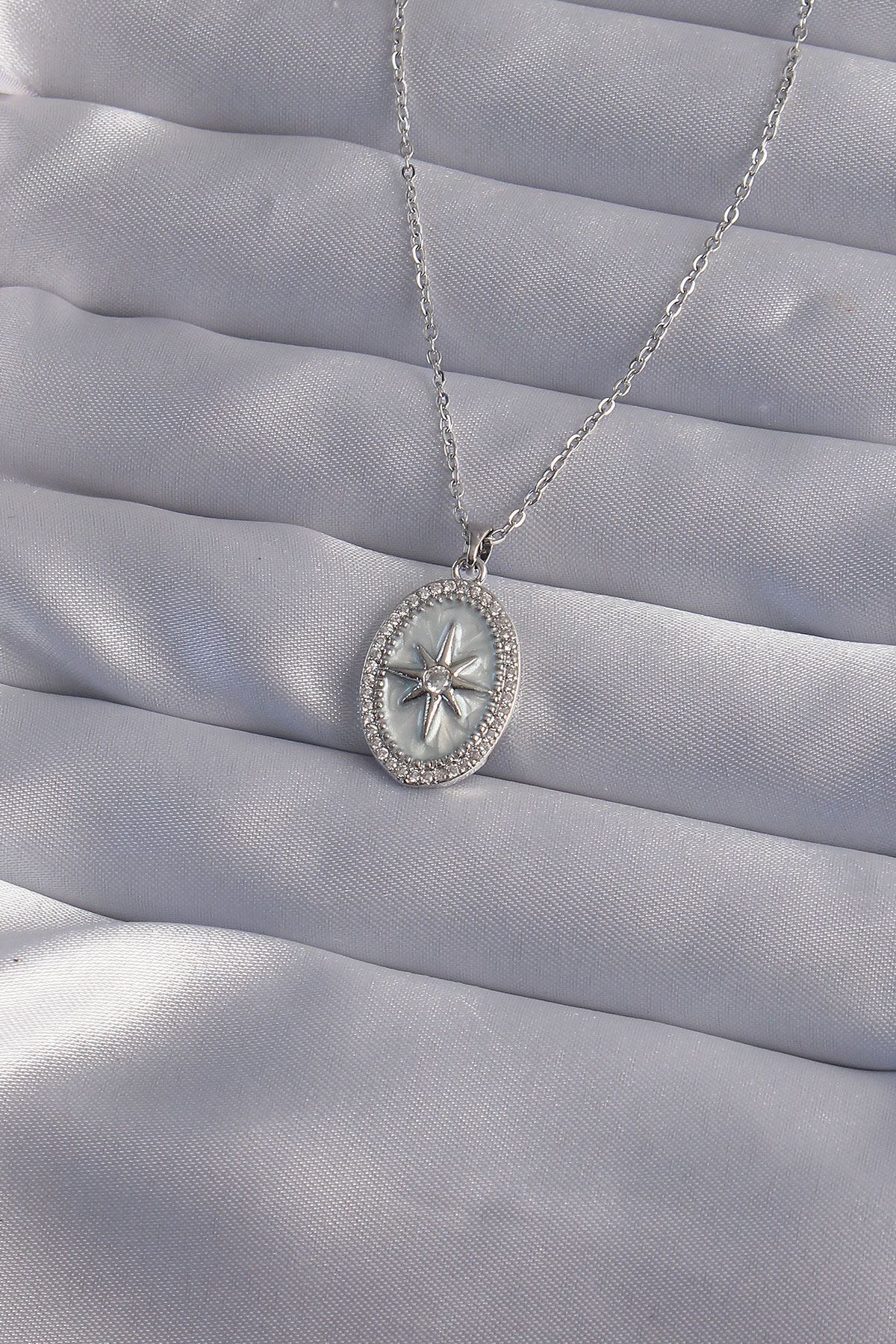 316L Çelik Zincir Gümüş Renk Zirkon Taşlı Kabartmalı Kutup Yıldızı Kolye - TJ-BKO9016
