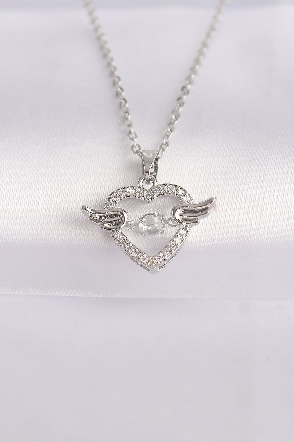 316L Çelik Zincir Gümüş Renk Zirkon Taşlı Kanatlı Kalp Kolye - TJ-BKO8627