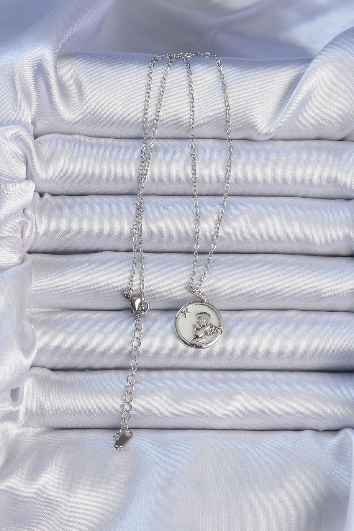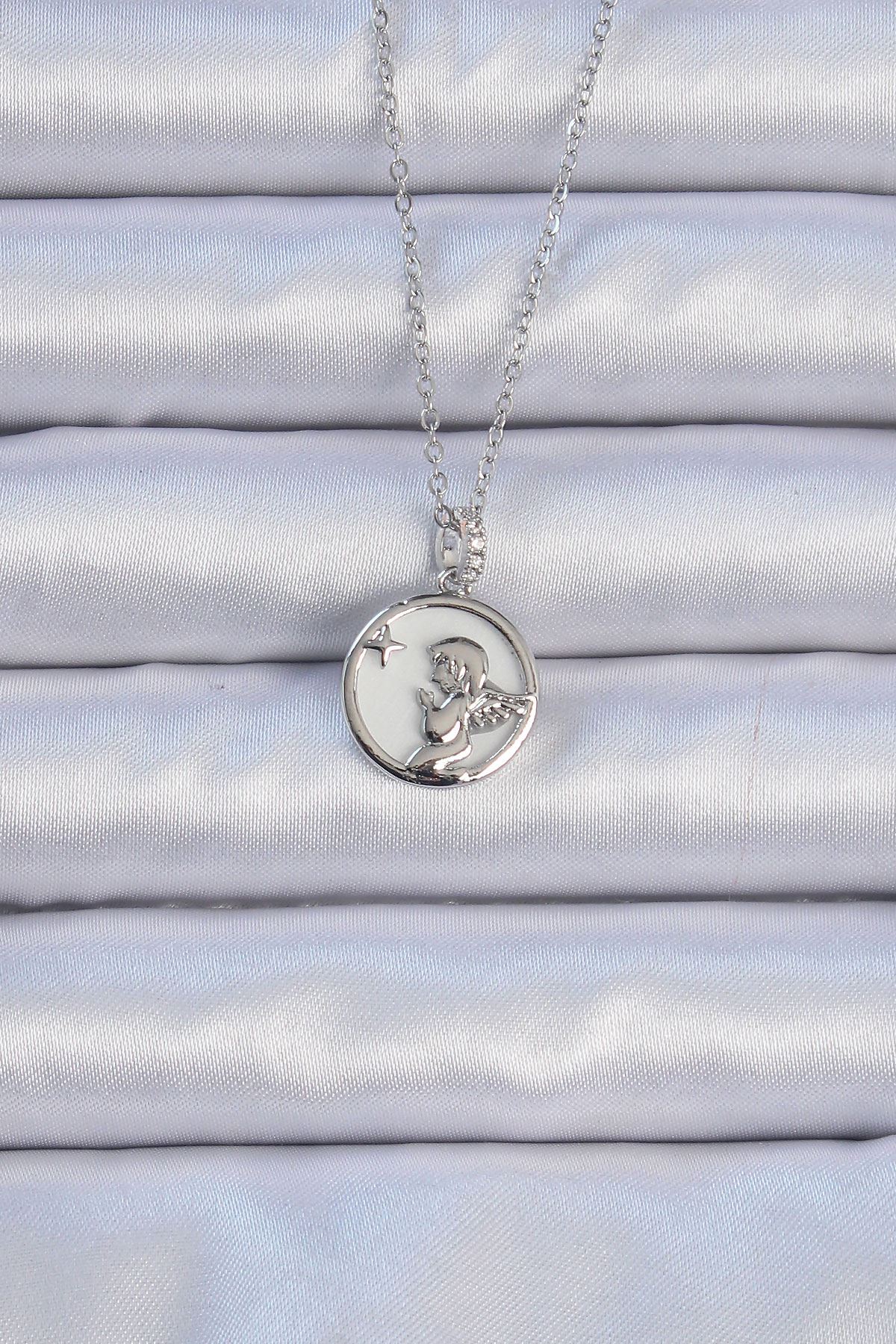 316L Çelik Zincir Gümüş Renk Zirkon Taşlı Mineli Melek Kolye - TJ-BKO9086