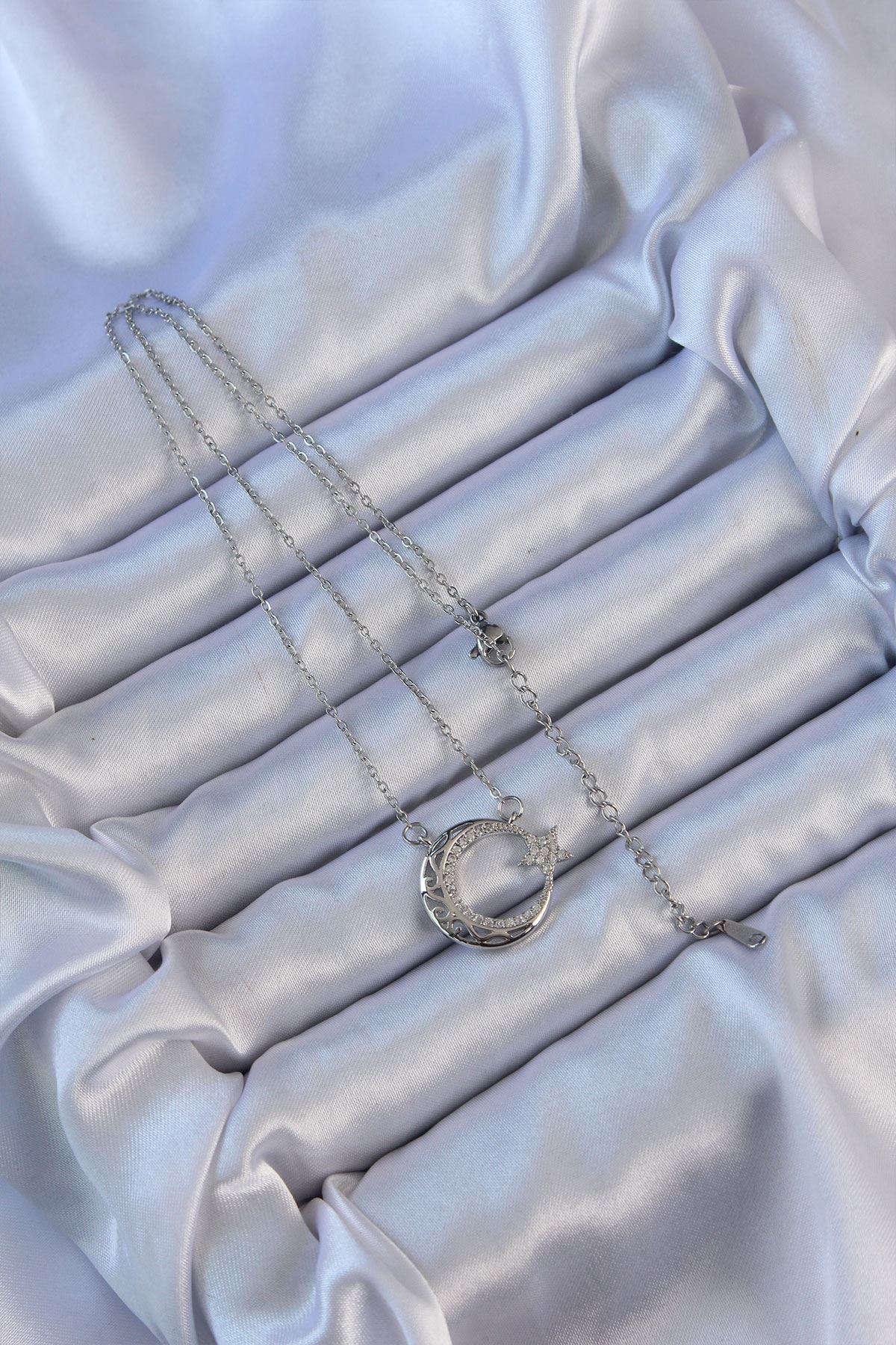 316L Çelik Zincir Gümüş Renk Zirkon Taşlı Motifli Ay Yıldız Kolye - TJ-BKO9116