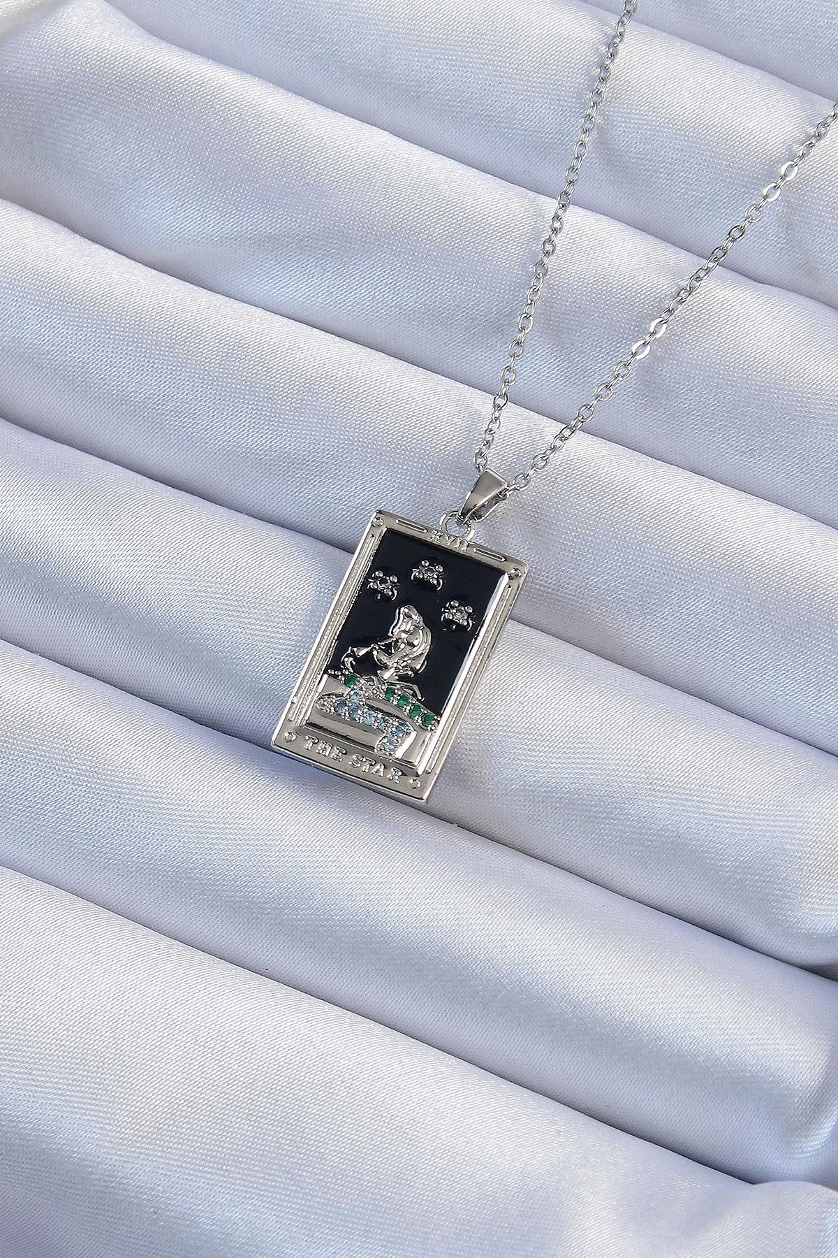 316L Çelik Zincir Gümüş Renk Zirkon Taşlı Siyah Mineli Kız Figürlü Tarot Kolye - TJ-BKO9228