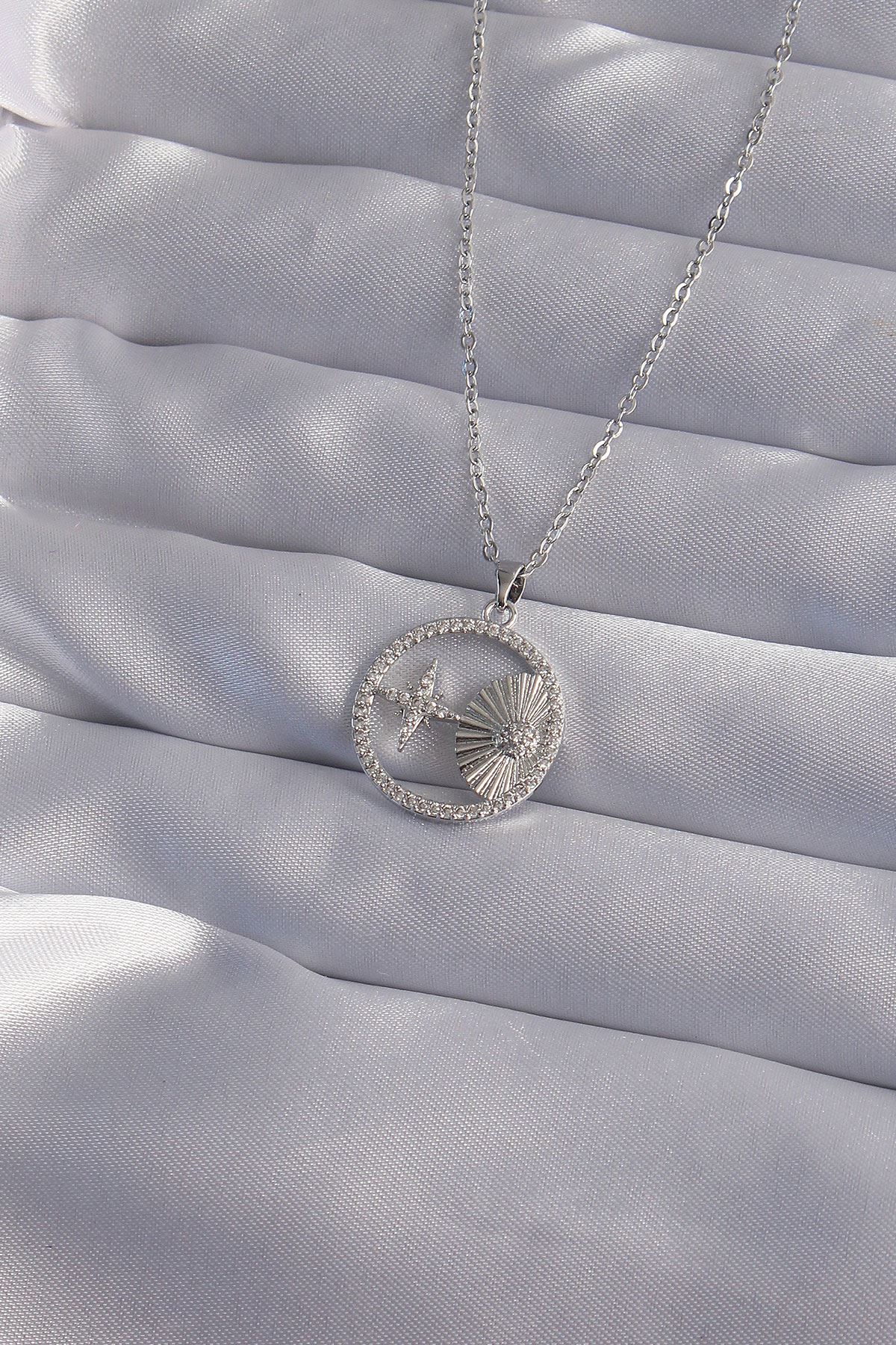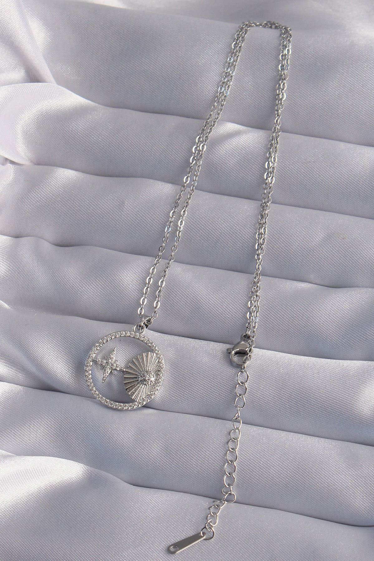 316L Çelik Zincir Gümüş Renk Zirkon Taşlı Yıldız Figürlü Oval Kolye - TJ-BKO9024