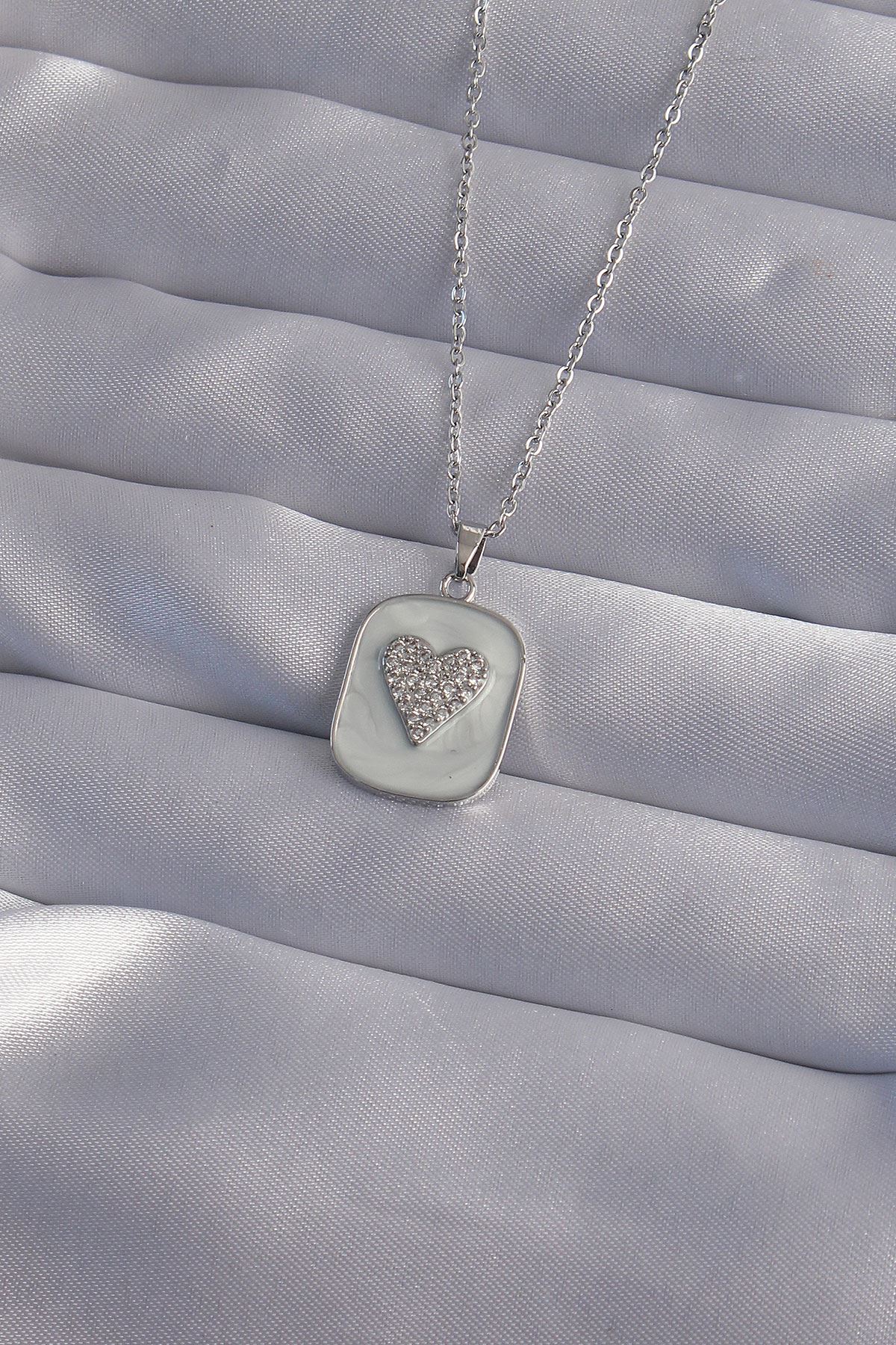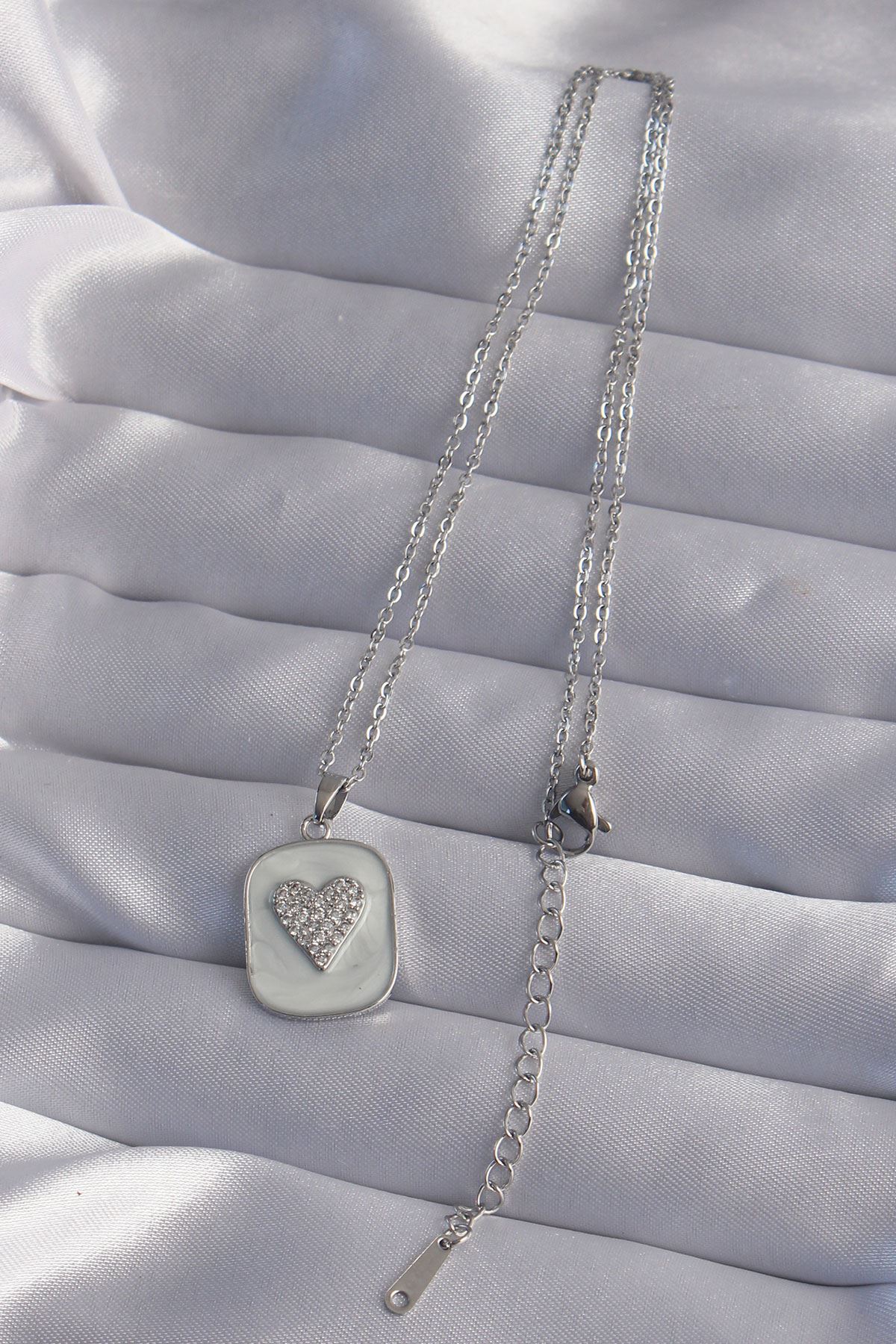 316L Çelik Zincir Mermer Desenli Gümüş Renk Zirkon Taşlı Kalp Model Kolye - TJ-BKO9014