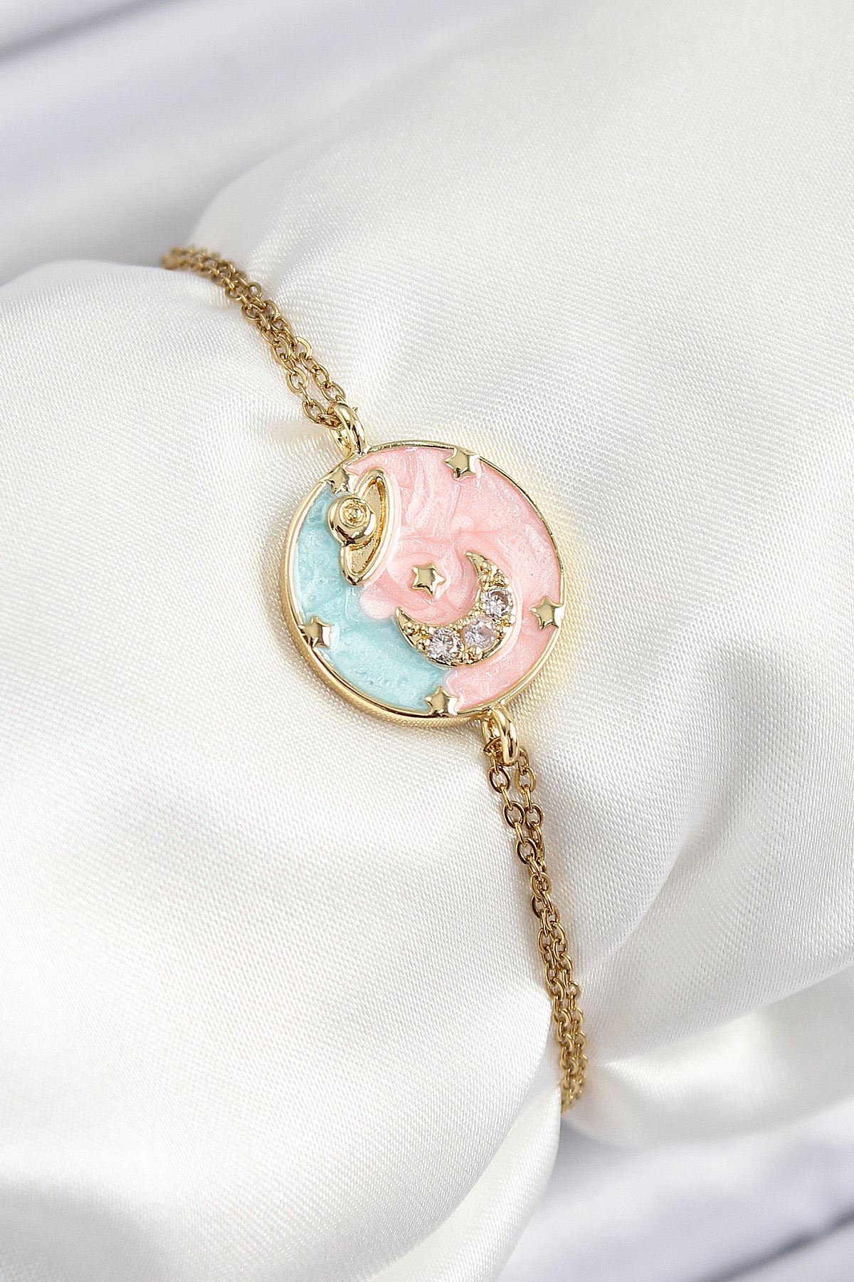 316L Çelik Zincir Mineli Sanatsal Portre Zirkon Taşlı Gezegen Model Gold Renk Kadın Bileklik - TJ-BB7234