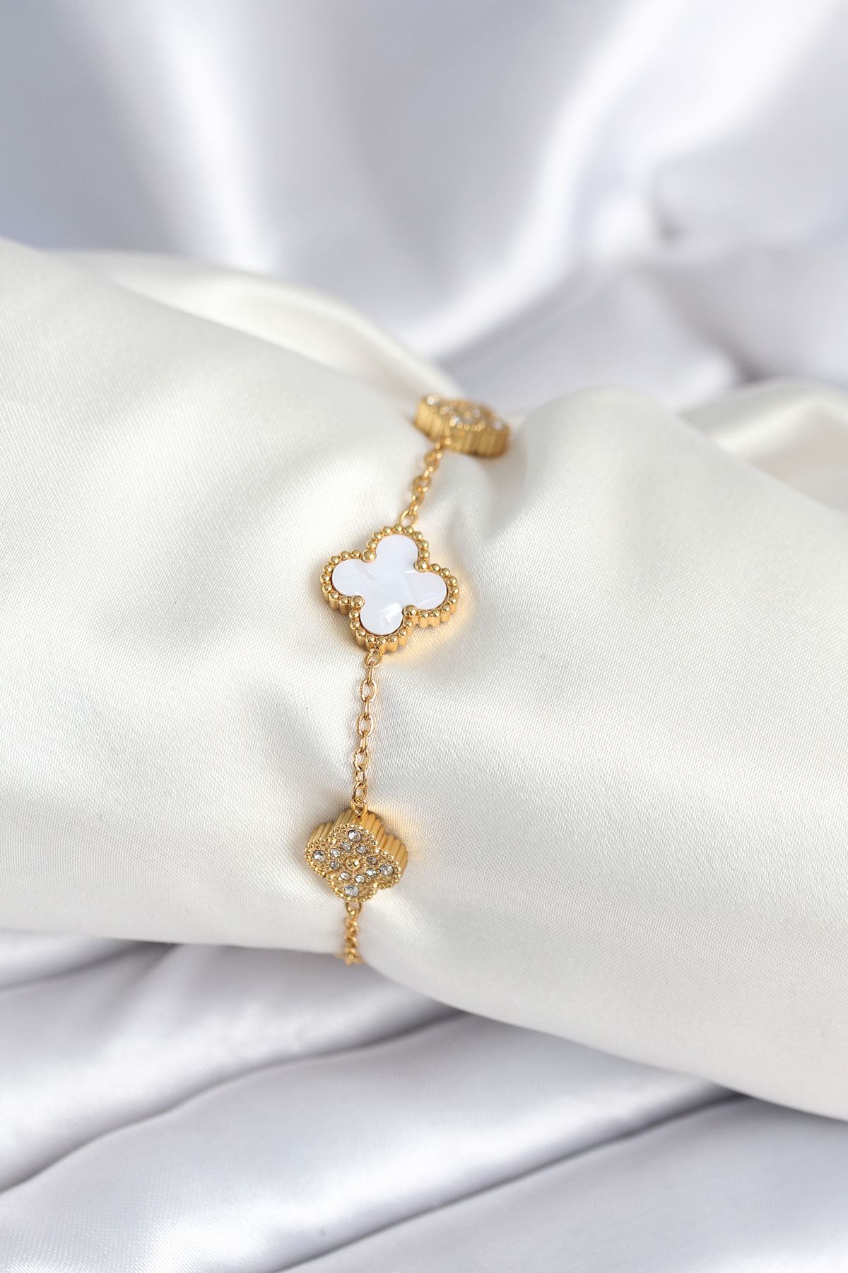 316L Çelik Zincir Zirkon Taşlı Yonca Beyaz Kadın Bileklik - TJ-BB7977