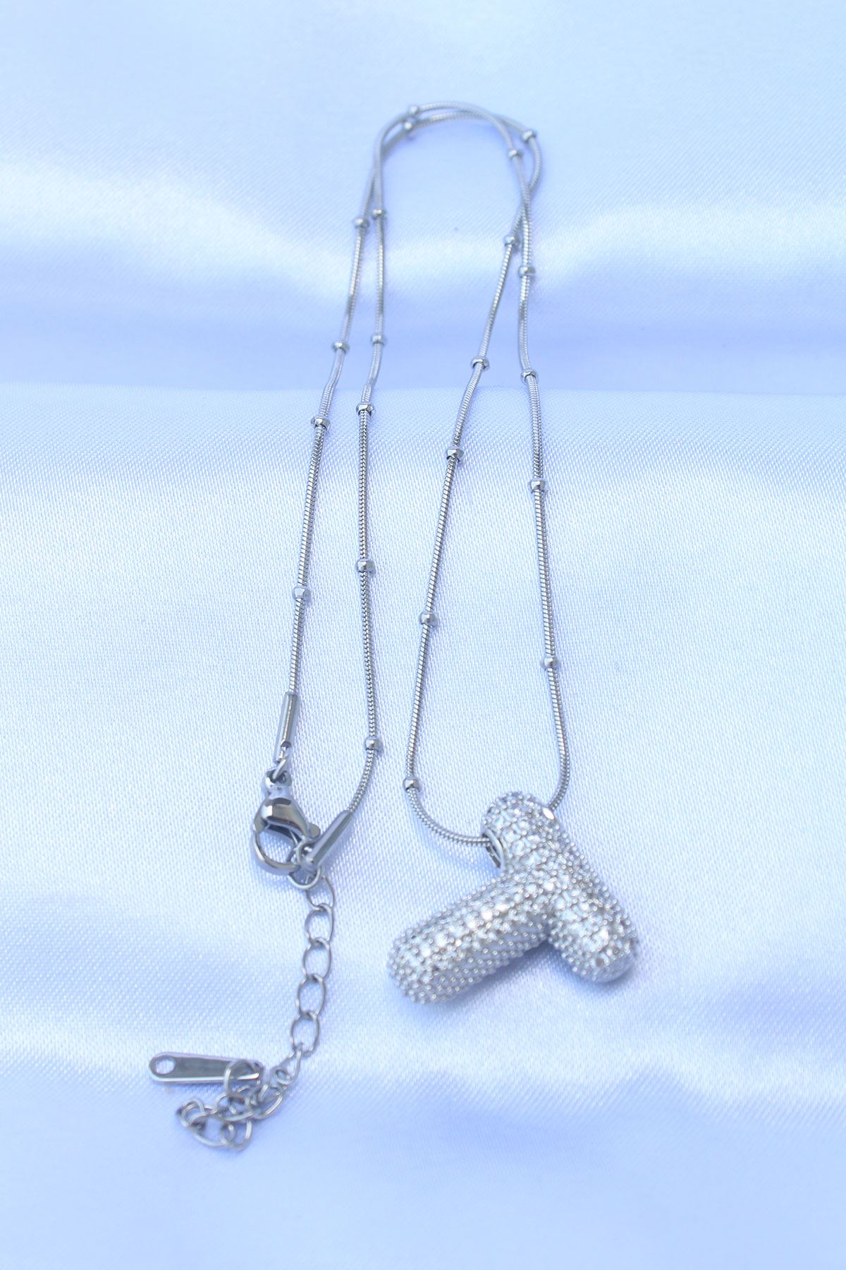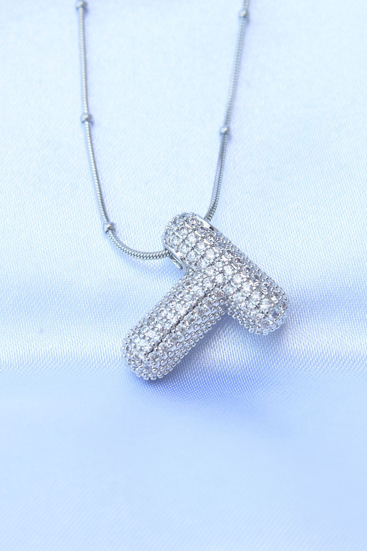 316L Çelik Zincirli Zirkon Taşlı T Harfli Gümüş Renk Bubble Kolye - TJ-BKO8721