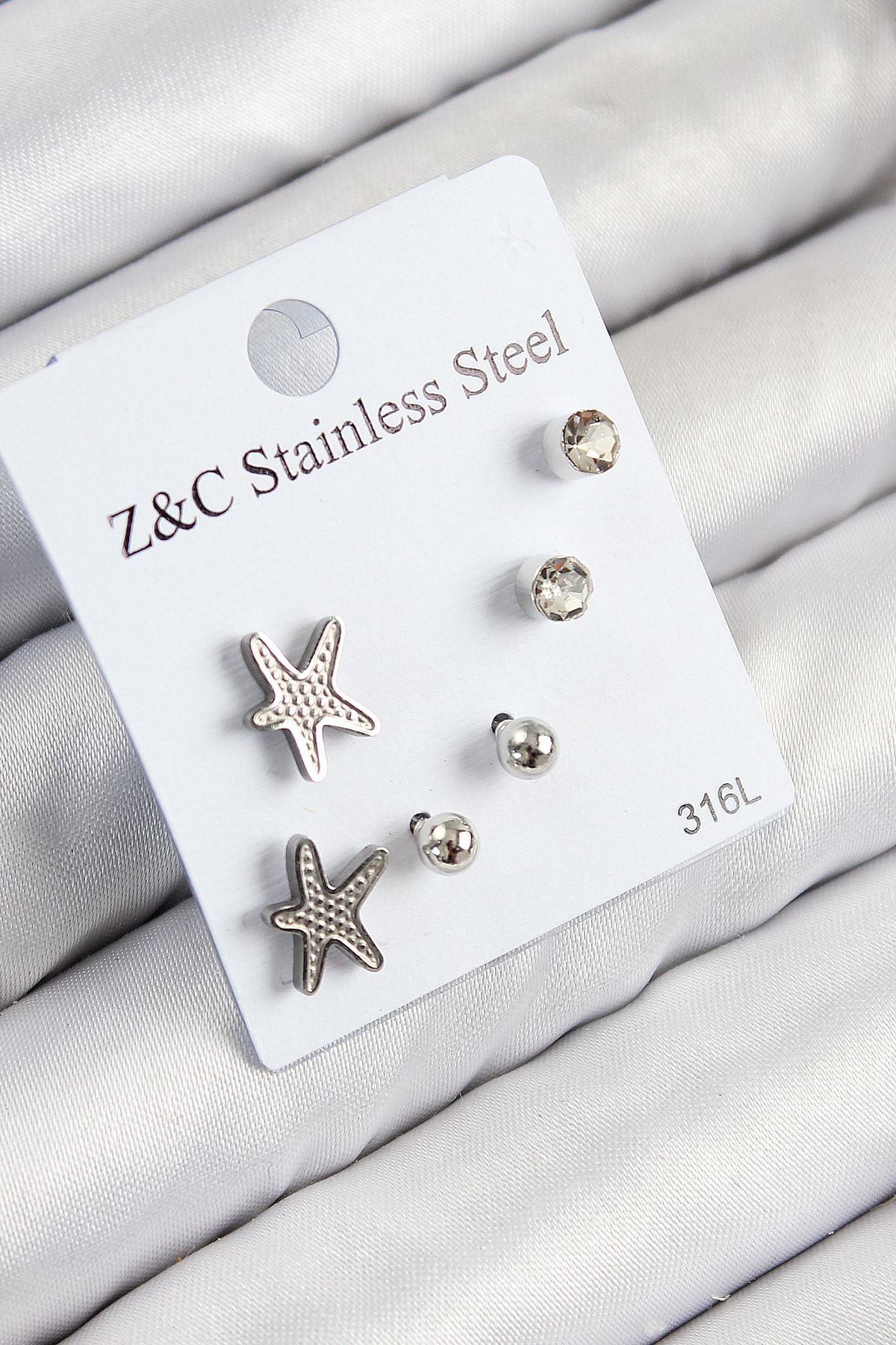 316L Çelik Zirkon Taşlı Deniz Yıldızı Model Gümüş Renk Kadın Set Küpe - TJ-BKP11119