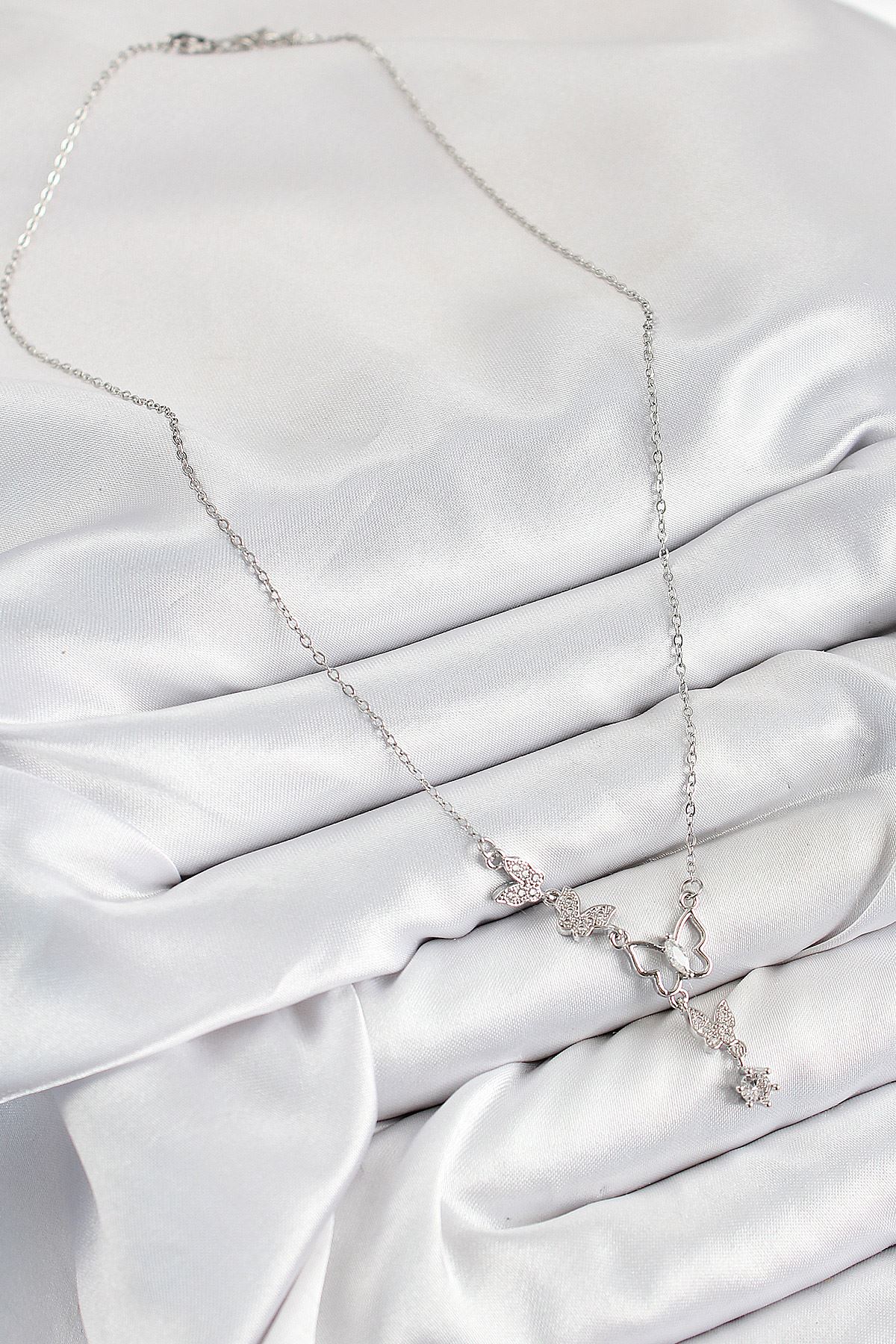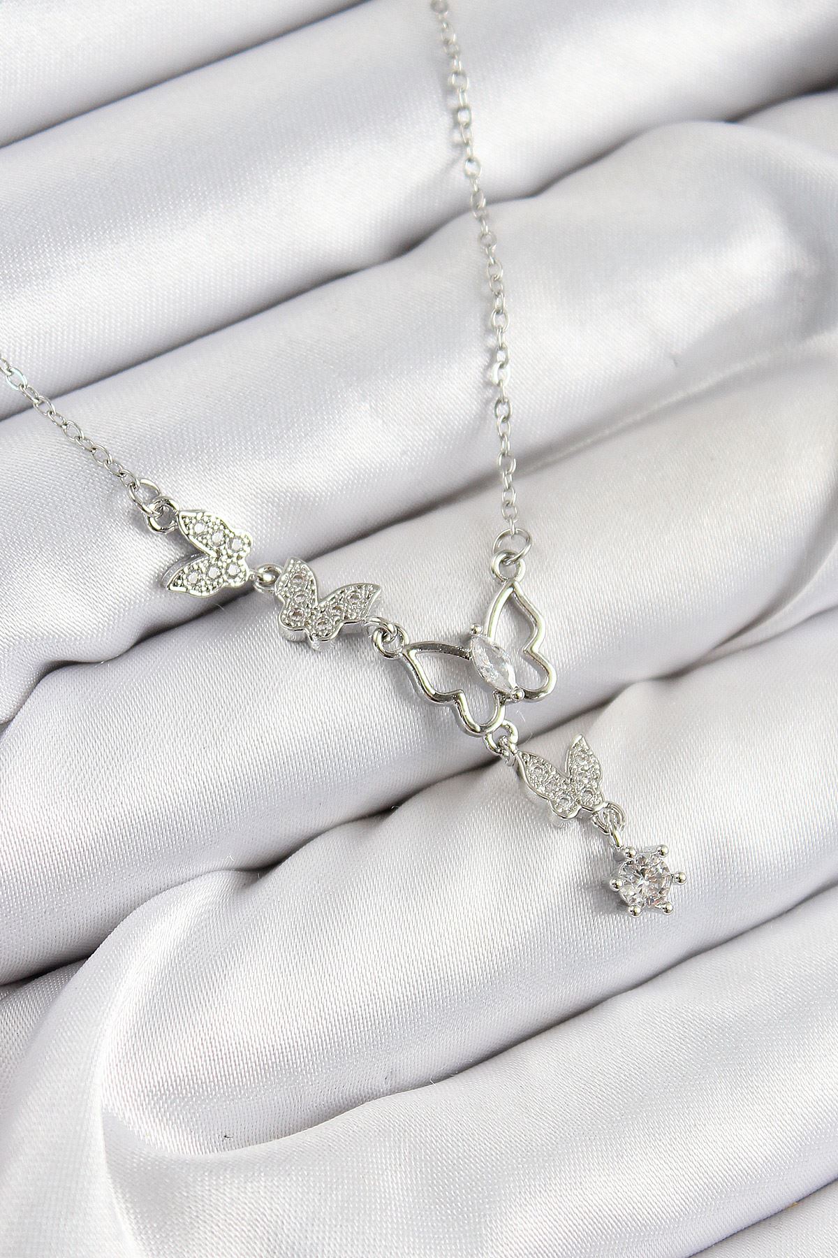 316L Çelik Zirkon Taşlı Kelebek Model Gümüş Renk Kadın Kolye - TJ-BKO10404