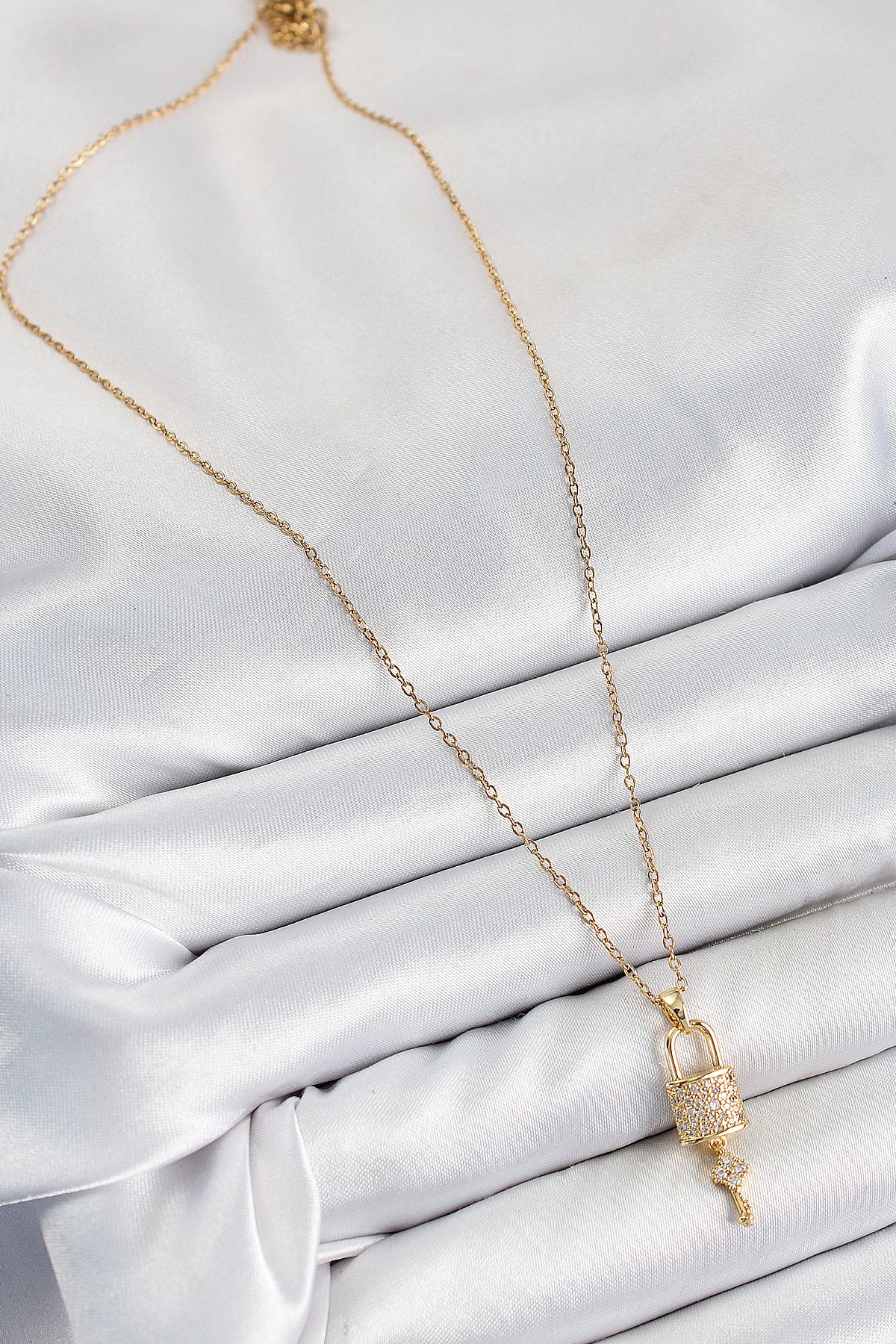 316L Çelik Zirkon Taşlı Kilit Ve Sallantılı Anahtar Model Gold Renk Kadın Kolye - TJ-BKO10353