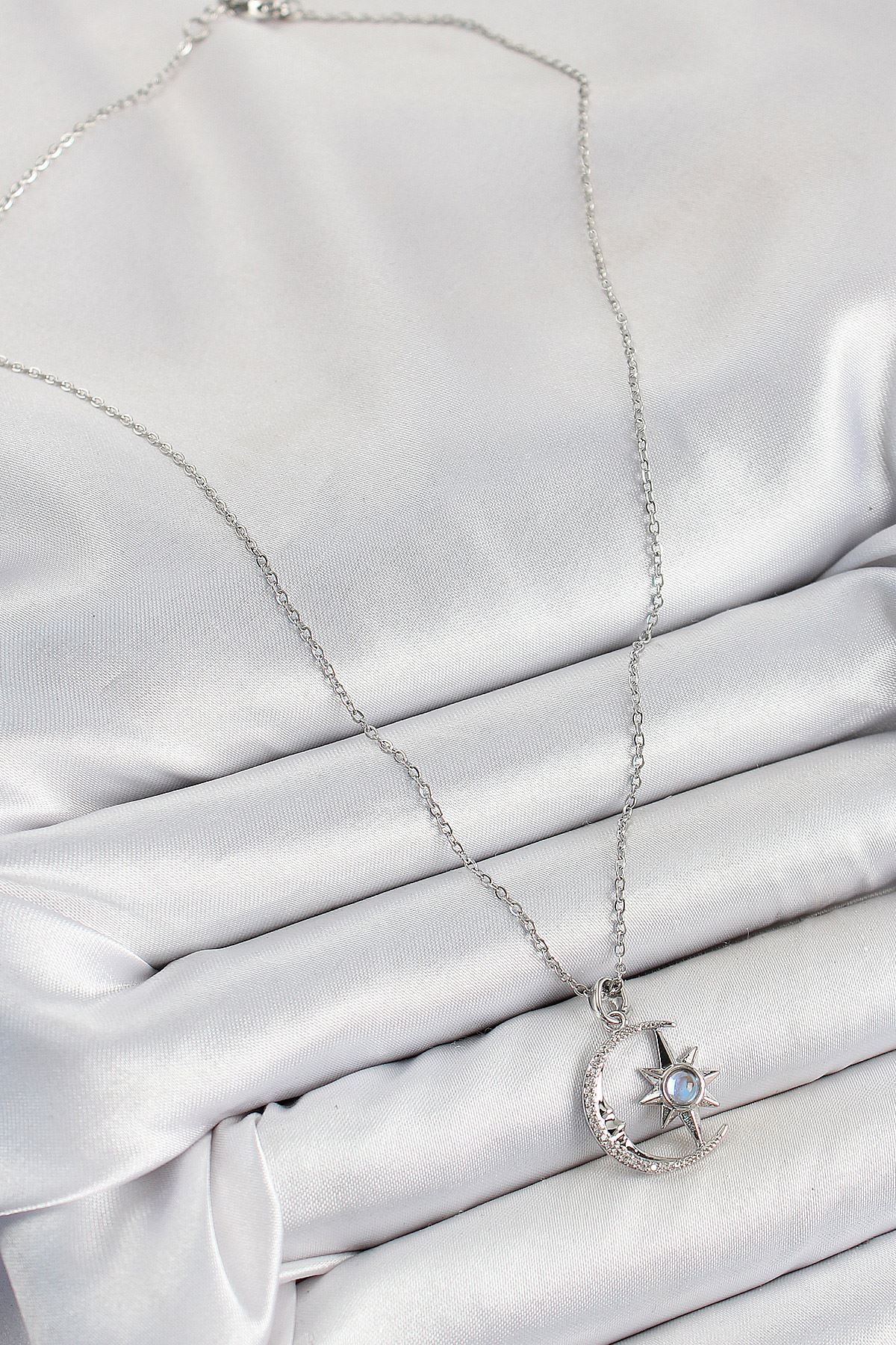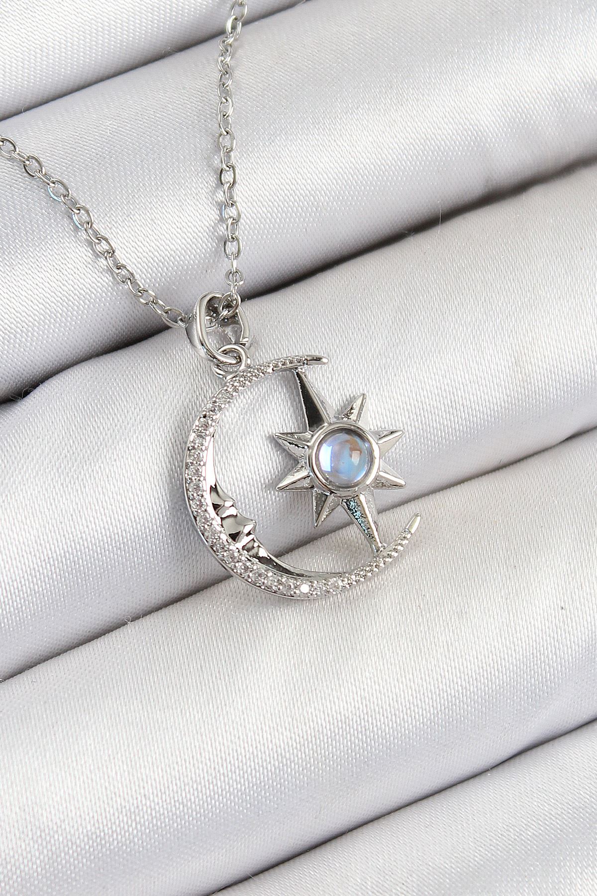 316L Çelik Zirkon Taşlı Kutup Yıldızlı Hilal Model Gümüş Renk Kadın Kolye - TJ-BKO10342